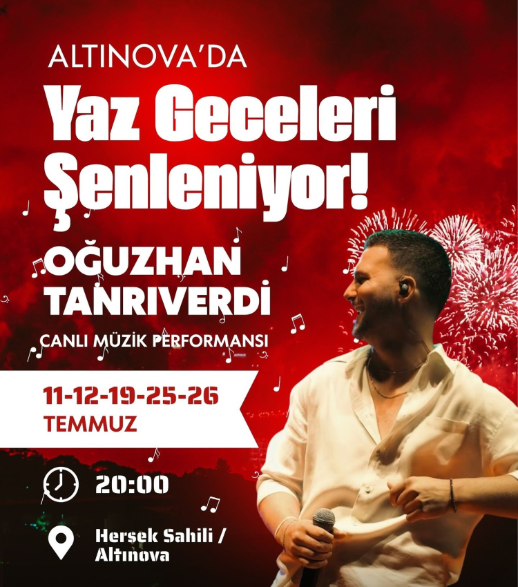 Yalova'nın Altınova ilçesinde yaz geceleri bu yıl dolu dolu geçecek. Altınova Belediyesi tarafından Temmuz ayı boyunca düzenlenecek etkinliklerle ilçe halkı hem eğlenecek hem de bir araya gelerek sosyalleşme fırsatı bulacak. Müzikseverleri bekleyen en özel sürprizlerden biri, Oğuzhan Tanrıverdi’nin sahne alacağı canlı müzik performansları. 11, 12, 19, 25 ve 26 Temmuz tarihlerinde saat 20.00’de Hersek Sahili’nde gerçekleştirilecek konserler, katılımcılara müzikle dolu keyifli anlar yaşatacak.
