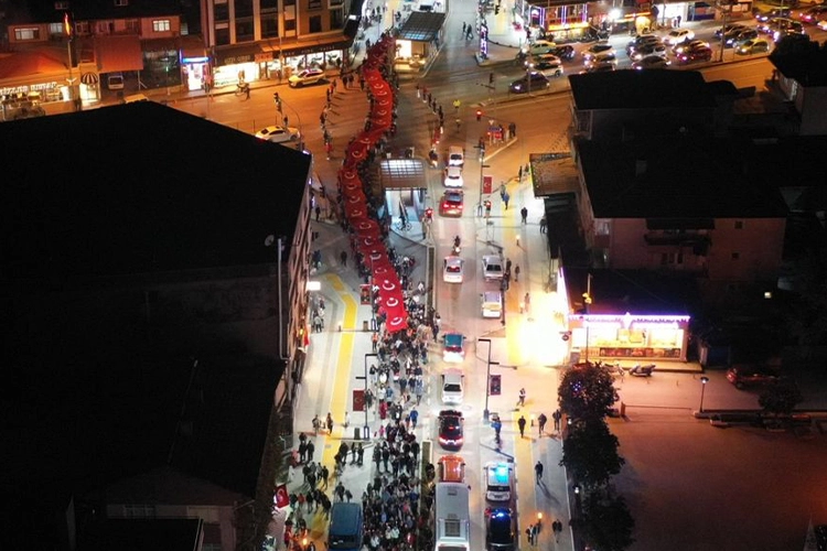 Altınova Kaymakamlık binası önünde başlayan yürüyüşte, 300 metre uzunluğundaki dev Türk bayrağı ellerde dalgalandı.