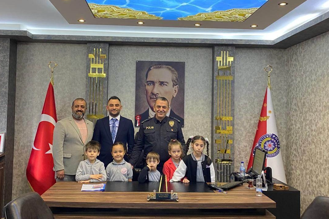 Tavşanlı Şehitlik İlkokulu öğretmen ve öğrencileri, 23 Nisan Egemenlik ve Çocuk Bayramı nedeniyle Altınova İlçe Emniyet Müdürlüğü’nü ziyaret ettiler. Makama oturan çocuklar İlçe Emniyet Müdürü H. Kürşat Seçer’den ilçenin asayiş durumu hakkından bilgi aldılar.