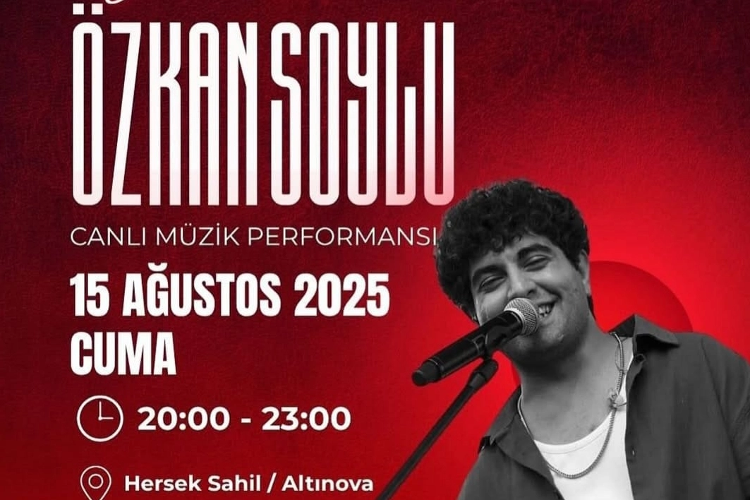ÖZKAN SOYLU'DAN UNUTULMAZ BİR PERFORMANSEtkinlik serisinin en dikkat çeken isimlerinden biri olan sevilen sanatçı Özkan Soylu, 15 Ağustos Cuma günü Hersek Sahili'nde sahne alacak. Canlı müzik performansı ile izleyicilere müzik ziyafeti sunacak olan Soylu, en sevilen şarkılarını Altınova'lılar için seslendirecek. Konser, saat 20:00'de başlayacak ve 23:00'e kadar devam edecek. Özkan Soylu'nun sahne enerjisi ve etkileyici sesi, dinleyicilere keyifli bir akşam yaşatırken, sanatçının güçlü yorumuyla şarkılar adeta yeniden hayat bulacak. Altınova Belediyesi yetkilileri, bu konserin bölge halkı için özel bir etkinlik olacağını ve herkesin bu müzik dolu geceye davetli olduğunu belirtti.