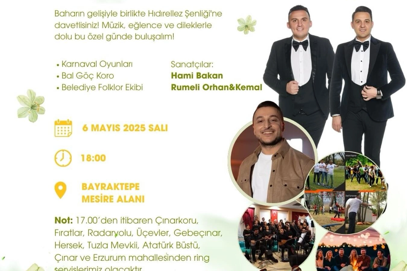 Başkan Fazlaca paylaşımında, ‘’Baharın coşkusunu birlikte yaşamaya hazır mısınız? 6 Mayıs Salı günü, Bayraktepe Mesire Alanı’nda düzenleyeceğimiz Hıdırellez Şenliğine hepinizi bekliyoruz! Karnaval oyunları, Bal-Göç Korosu, Altınova Belediyesi Halk Oyunları Topluluğu folklor ekibimizin gösterileri, Hami Bakan ile Rumeli Orhan & Kemal’in sahne performanslarıyla unutulmaz bir akşam yaşayacağız. Dileklerimizi dileyip, müzik ve eğlence dolu bir bahar akşamında buluşalım!’’ dedi.