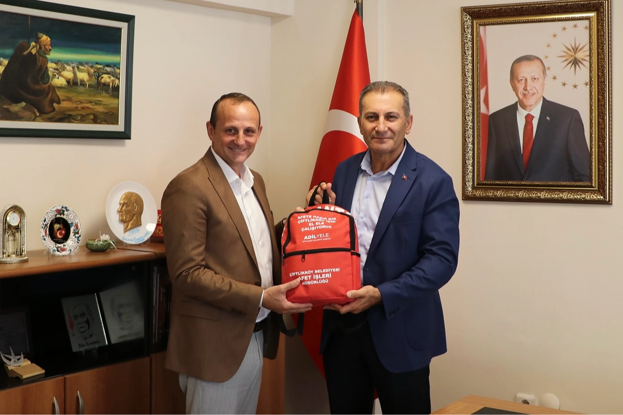 Çiftlikköy ilçesinin gelişimi için sürekli adımlar atmaya önem veren Belediye Başkanı Adil Yele, Yalova Kültür ve Turizm İl Müdürü Ziya Karatekin’i ziyaret ederek, ilçenin kültür ve turizm alanındaki ihtiyaçlarını ve hedeflerini paylaştı. Başkan Yele, Çiftlikköy Belediyesi tarafından hazırlanan afet çantasını Karatekin’e takdim ederek, afetlere karşı alınacak önlemler konusunda bir kez daha farkındalık yaratmanın önemine vurgu yaptı. Yele gerçekleştirdiği bu ziyaretin ardından Aile ve Sosyal Hizmetler İl Müdürü Arif Laçin ile bir araya geldi. Yele burada da Laçin’e afet çantasını takdim ederken, kendisiyle hoş bir sohbet gerçekleştirdi. Başkan Yele ziyaretleri sonrasında Karatekin ile Laçin’e misafirperverliği ve hoş sohbeti için teşekkür etti.