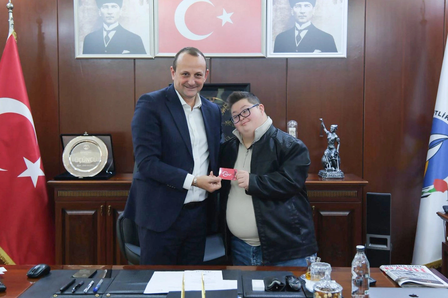 Çiftlikköy Belediyesi’ne bağlı tüm sosyal tesislerde yüzde 30 indirim imkânı sunan Elele Kart’ın avantajlarından, yeni yıl itibarıyla artık engelli bireylerin de faydalanabildiğini belirten Başkan Yele, bu kapsamdaki ilk Elele Kart’ı da Çiftlikköy’ün sempatik yüzü, Hamza Ubeyd Örence’ye takdim etti. Geçtiğimiz yıldan bugüne anneler, emekliler ve öğrenciler olmak üzere bin 800 Çiftlikköylünün Elele Kart kullanıcısı olduğunu aktaran Başkan Yele, “Şimdi Elele Kart ile dayanışmayı büyütüyoruz. Geçtiğimiz sene hizmete aldığımız Elele Kart uygulamamızdan, yeni yıl itibarıyla özel gereksinimli hemşehrilerimizin de faydalanabileceğini duyurmuştuk. Bugün de bu kapsamda ilk kart teslimini Hamza Ubeyd Örence kardeşimize yaptım. El ele belediyecilik mottosuyla ilçemizdeki dayanışmayı büyütmeye, herkes için daha erişilebilir bir ilçe olmaya devam edeceğiz” diye konuştu.