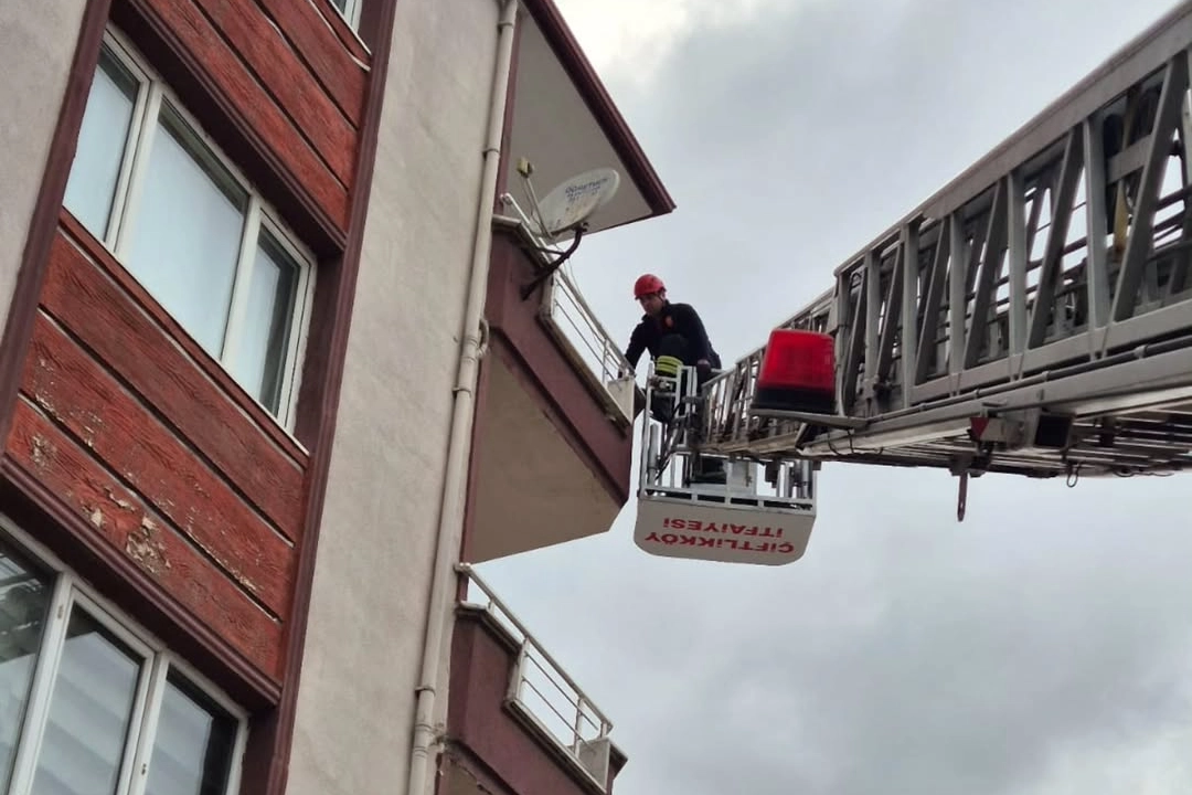 YANGIN MERDİVENİYLE 5. KATA TIRMANDILARİhbar üzerine Çiftlikköy Belediyesi İtfaiye Müdürlüğü ekipleri olay yerine intikal etti. Tüm uğraşlara rağmen dairenin kilitli kapısını açamayan itfaiye ekipleri başka bir yol denemeye karar verdi. İtfaiye aracının yangın merdiveniyle 5. kata tırmanan itfaiye ekipleri, balkondan içeri girerek çocuğu kurtardı.