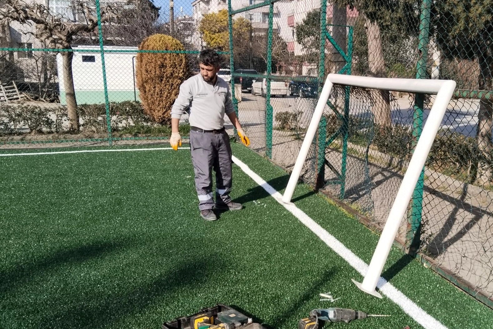 Çocuk parklarında suni çim zeminli mini saha sayısı 14’e çıkarılırken, kale direkleri gibi malzemeler de belediyenin öz kaynaklarıyla yeniden üretilerek sahalara yerleştiriliyor.