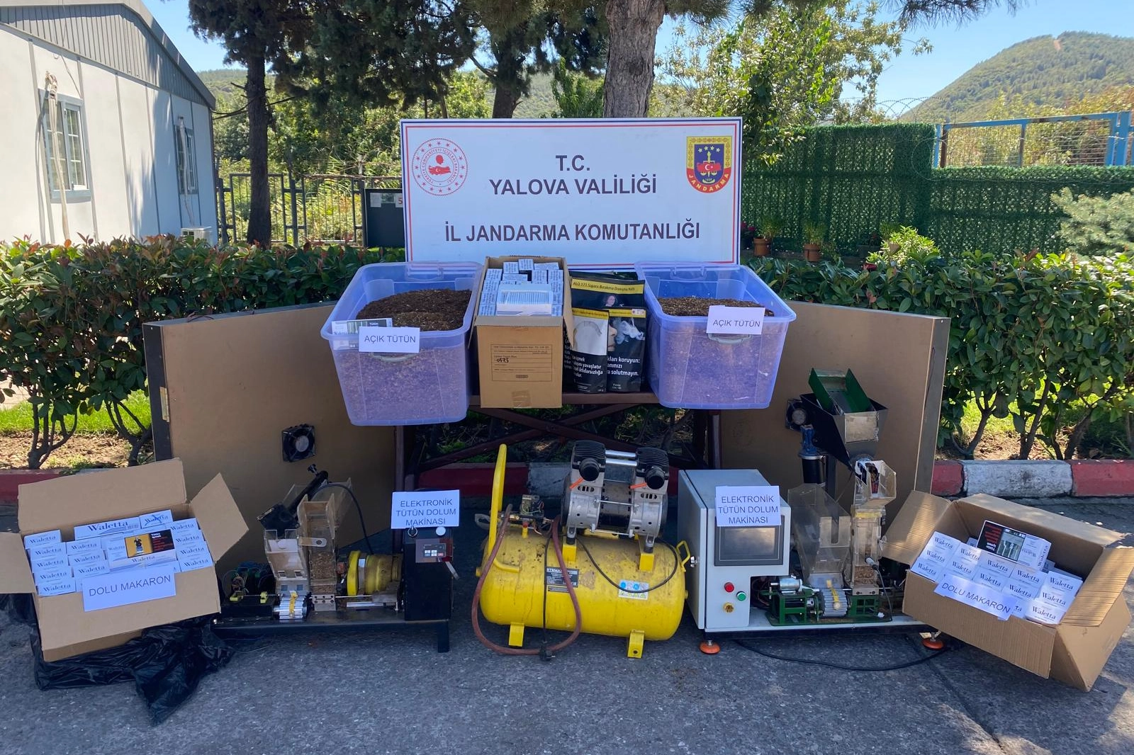 Yalova İl Jandarma Komutanlığınca Kaçakçılık ve Organize Suçlar Şube Müdürlüğü ile Çiftlikköy İlçe Jandarma Komutanlığı unsurlarınca, 21 Ağustos 2025 tarihinde Çiftlikköy ilçesinde M.A. ve İ.A. adlı şahıslara ait adres ve araçlarda yapılan aramalar neticesinde 1.150 Kg bandrolsüz kaçak tütün, 84.200 Adet boş makaron, 21.424 Adet dolu makaron, 2.000 Adet boş sigara paketi, 109 Paket kaçak sigara, 2 Adet elektronik tütün doldurma makinası, 1 Adet kompresör, 2 Adet fanlı tütün kurutma düzeneği, 1 Adet nem ölçer, 1 Adet terazi ele geçirildi.
