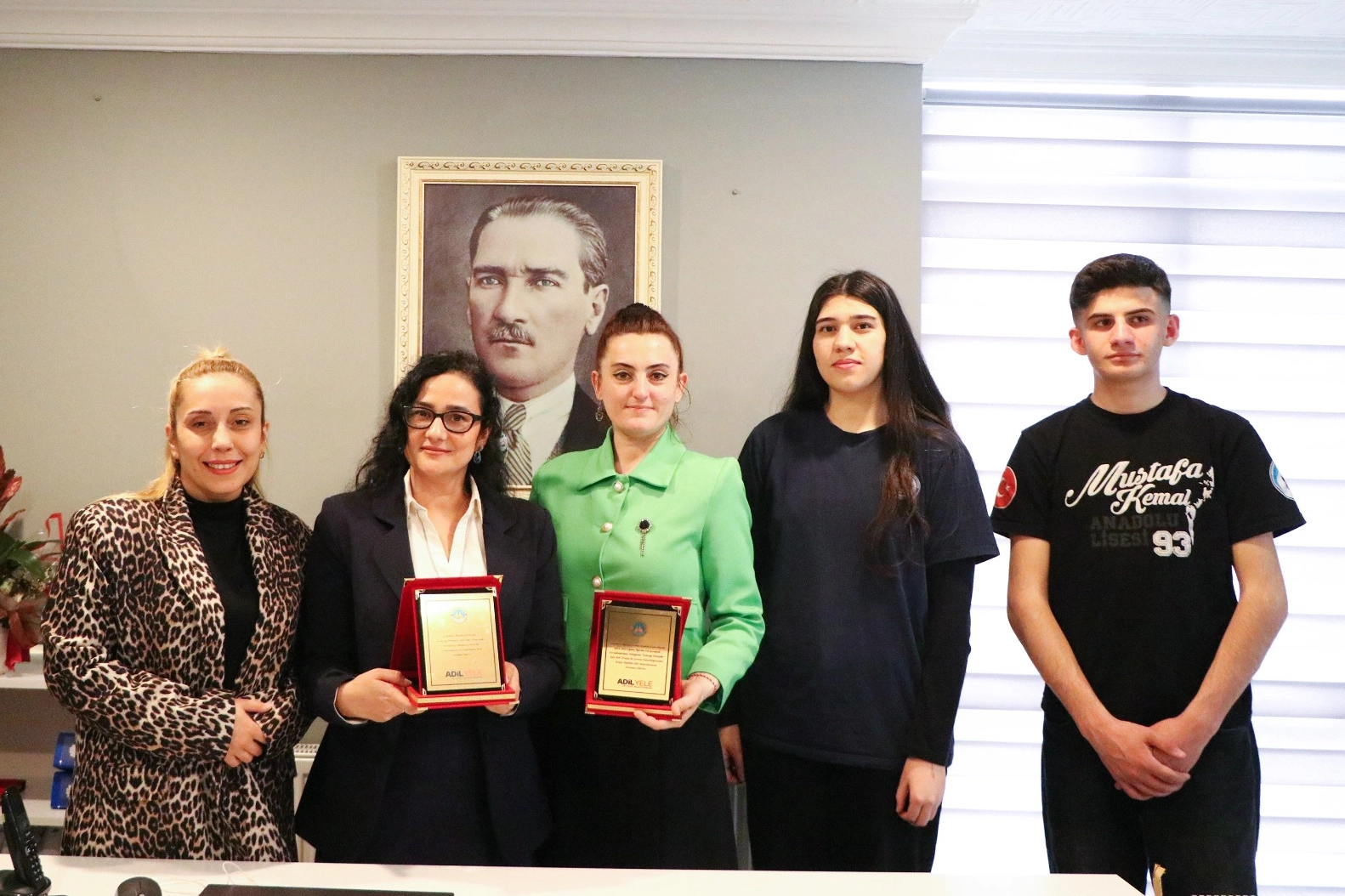 Aras, sıfır atık şampiyonu öğrencilerle birlikte Okul Müdürü ve Proje Yöneticisi Selda Altan ile Proje Öğretmeni Fatma Kaya’ya da, Başkan Yele adına teşekkür plaketlerini takdim etti.