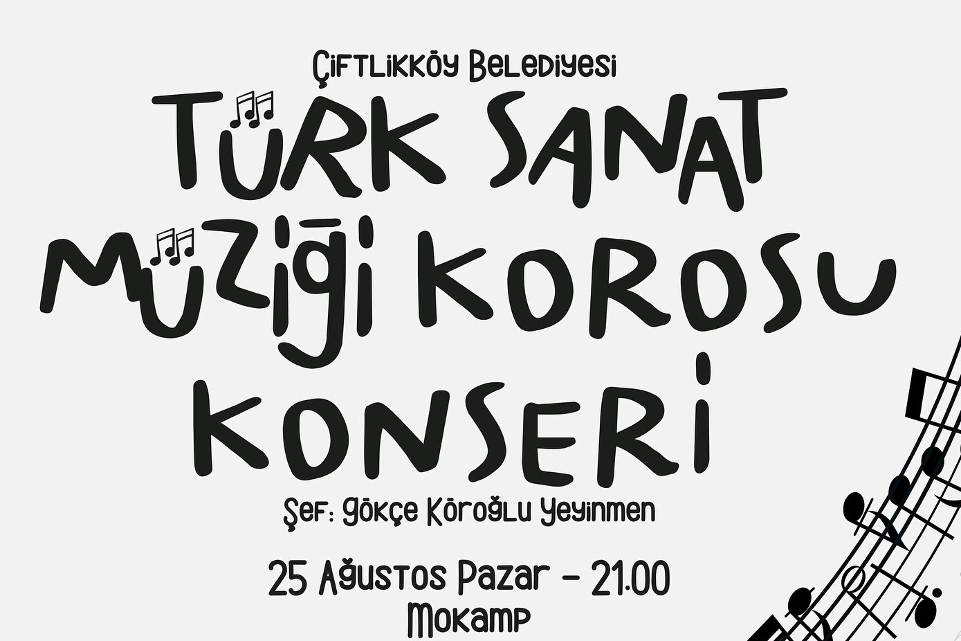 Çiftlikköy Belediyesi tarafından gerçekleştirilecek olan, Türk Sanat Müziği konseri hakkında yapılan açıklamada şu ifadelere yer verildi, ‘’Türk Sanat Müziği’nin büyülü tınılarına hazır mısınız? Şef Gökçe Köroğlu Yeyinmen yönetimindeki Türk Sanat Müziği Koromuz, 25 Ağustos Pazar akşamı saat 21.00’de Mokamp’ta sizlerle buluşuyor. Unutulmaz bir müzik ziyafeti için hepinizi bekliyoruz.’’