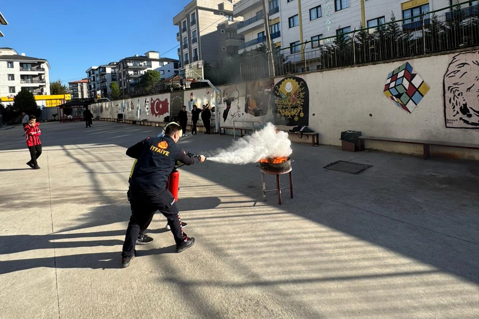Teorik eğitim sonrasında okul bahçesinde yangın söndürme tüpüyle çıkarılan suni yangını söndürme çalışması yapıldı. Çiftlikköy Şehit Muhammed İslam Altuğ Anadolu İmam Hatip Lisesi’nde gerçekleştirilen yangın eğitiminin sonrasında da uygulama çalışması yapıldı.