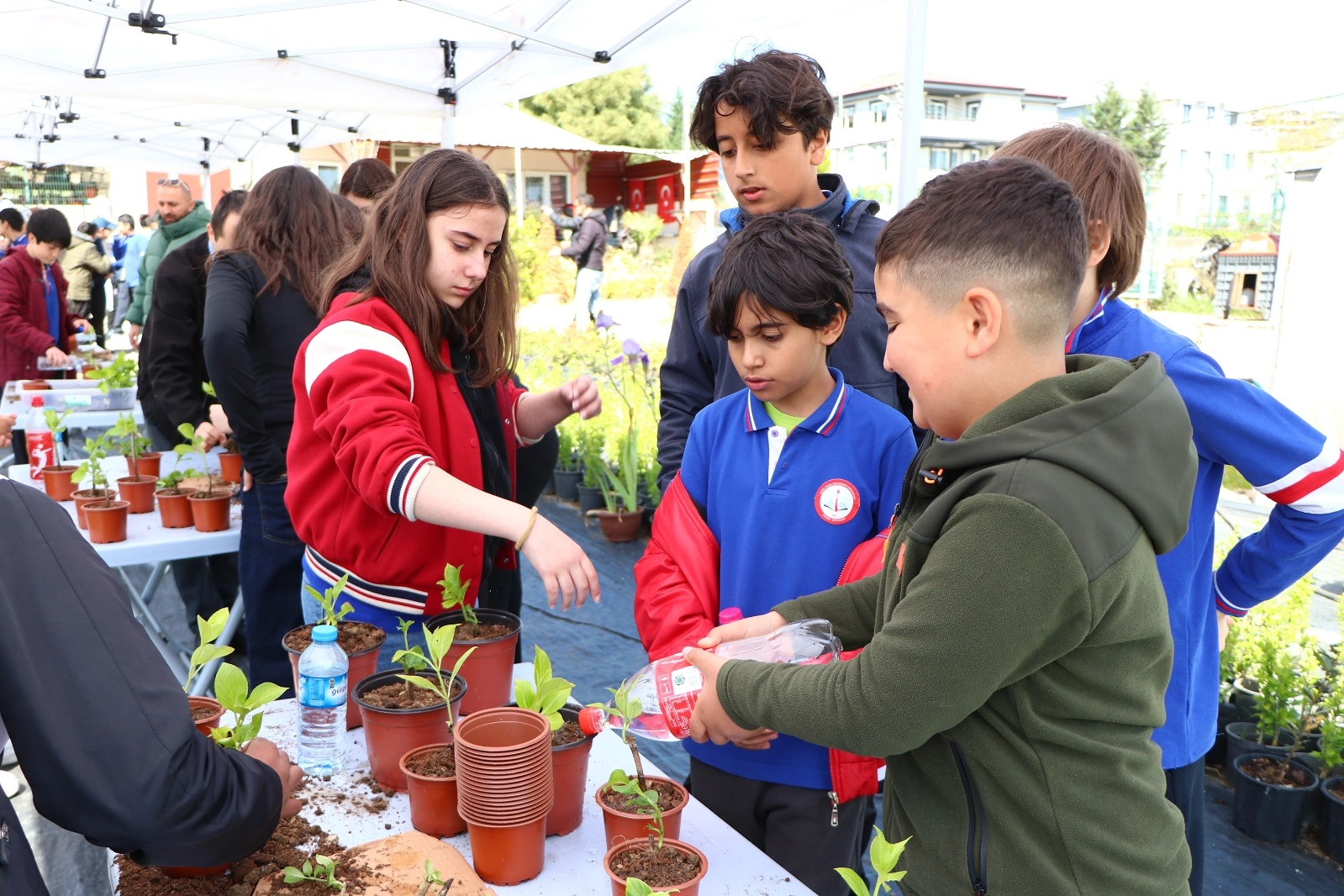 Bitki üretiminin inceliklerini öğrenen öğrenciler, tohum yatağından aldıkları ortanca fidelerini hep birlikte saksılara dikerek, bitkilerin büyüme serüvenine katkıda bulundu.