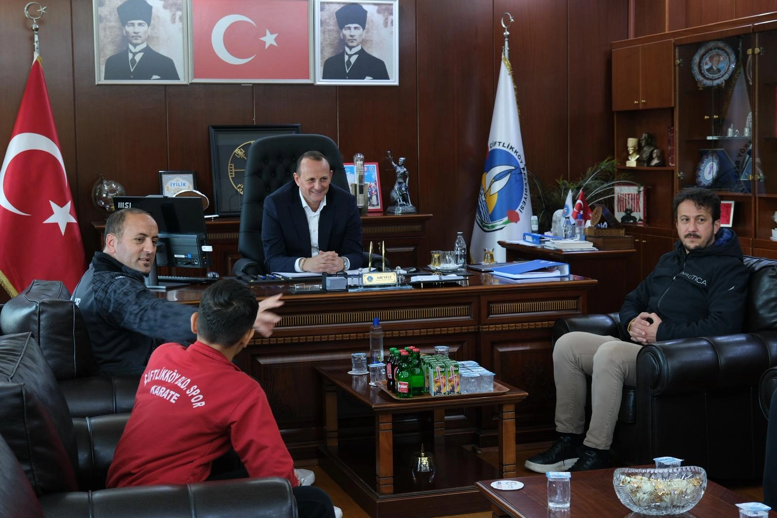 Ziyarette Belediyespor Karate Takımı Başantrenörü Halil İbrahim Yüksektepe ve Karate Antrenörü Emirhan Özüdoğru’nun yanı sıra Çiftlikköy Belediyespor Başkan Yardımcısı Suat Kaan Aydın, Basketbol Şube Sorumlusu Selçuk Balcı, Belediyespor Yönetim Kurulu üyeleri Atilla Arı ve Mesut Özyer yer aldı.
