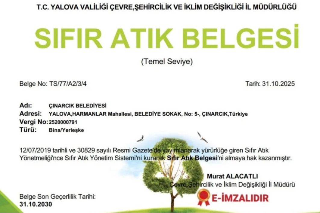 Çınarcık Belediyesi Destek Hizmetleri Müdürlüğü’ne bağlı Sıfır Atık Birimi tarafından belediye hizmet binasında kurulan Sıfır Atık Yönetim Sistemi ile; kâğıt, karton, plastik, cam, metal, evsel atık ve atık piller ayrı ayrı toplanarak geri dönüşüme gönderiliyor. Ayrıca, binada bitkisel atık yağ toplama noktası da bulunuyor. Çınarcık Belediyesi; atık oluşumunun önüne geçmek, israfı önlemek ve kaynakların daha verimli kullanılmasını sağlamak amacıyla çalışmalarını kararlılıkla sürdürüyor. Bu çalışmalar doğrultusunda önemli adımlar atan belediye, 12.07.2019 tarihli ve 30829 sayılı Resmî Gazete’de yayımlanarak yürürlüğe giren Sıfır Atık Yönetmeliği kapsamında Sıfır Atık Belgesi’ni yenilemeye hak kazandı.