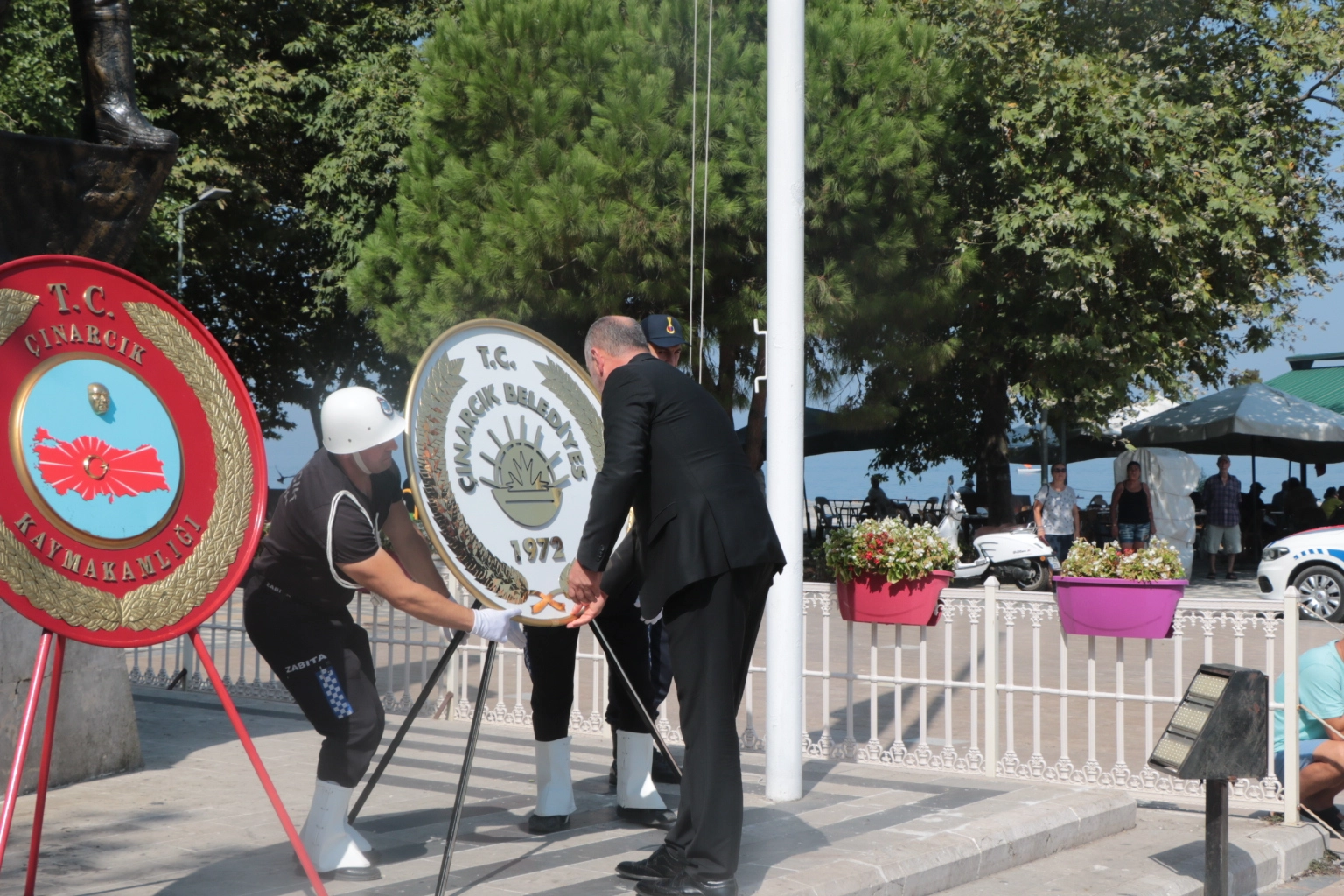 Çınarcık’ta 30 Ağustos Zafer Bayramı kutlama programı, Çınarcık Kaymakamlığı Hükümet Konağı’nda Çınarcık Kaymakamı Cemil Aksak’ın tebrikleri kabulü ile başladı. Ardından protokol üyeleri ve vatandaşlar, Çınarcık Cumhuriyet Meydanı’nda bulunan Atatürk Anıtı’na geçti. Burada Atatürk Anıtı’na çelenklerin sunulması, saygı duruşunda bulunulması ve İstiklal Marşı’nın okunmasının ardından, Jandarma Astsubay Çavuş Özcan Özkan tarafından günün anlam ve önemini belirten bir konuşma yapıldı.
