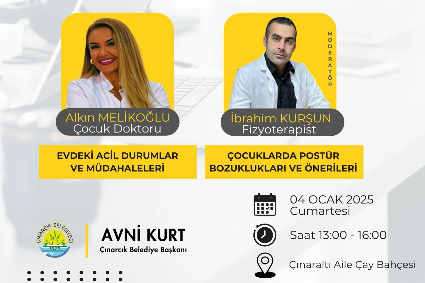 04 Ocak Cumartesi günü 13.00-16.00 saatleri arasında Çınaraltı Aile Çay Bahçesinde gerçekleşecek olan seminerde Dr. Alkın Melikoğlu “Evdeki Acil Durumlar ve Müdahaleleri” konusunu, Fzt. İbrahim Kurşun ise “Çocuklarda Postür Bozuklukları ve Önerileri” konusunu ele alacak.