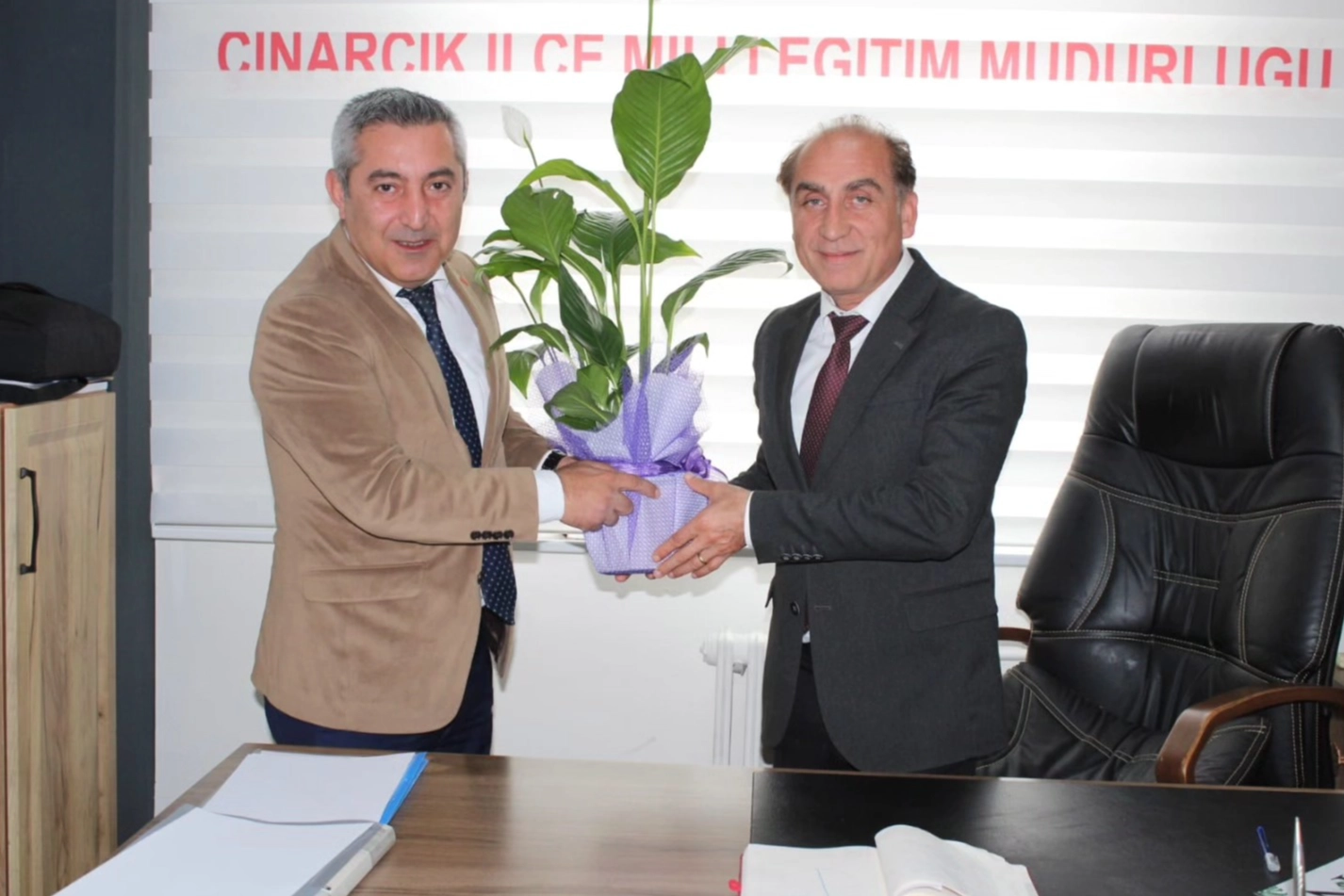 Yalova Güzel Sanatlar Lisesi Okul Müdürü Haydar Kılıç, Çınarcık İlçe Millî Eğitim Müdürü Mesut Demirci’yi makamında ziyaret ederek çiçek takdiminde bulundu.