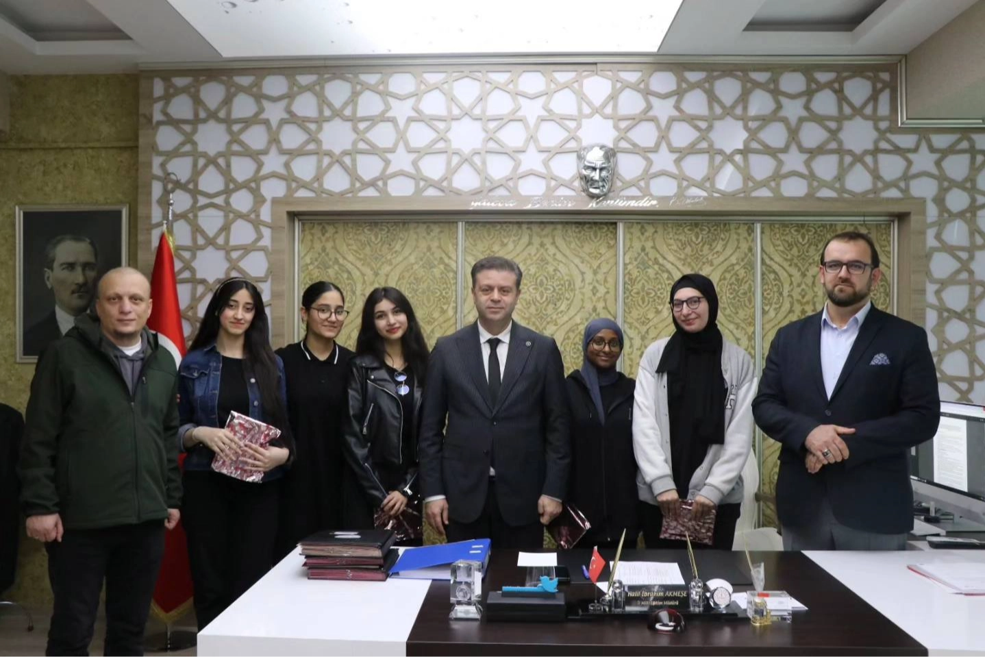 Yalova İl Milli Eğitim Müdürü Halil İbrahim Akmeşe “Çocuk Eğitiminde Çevre ve Aile Etkisi” konulu İngilizce Münazara Yarışmasında Yalova il birincisi olan Zehra Ekşinozlugil Anadolu İmam Hatip Lisesi öğrencileri Ruaa Fouad, Yasemin Ali, Dalia Alsudani, İman Wehbeh ve Sara Al Bayati ile öğretmenleri Kâmil Kasım’ı makamında konuk etti ve il birincisi öğrencilerin her birini tek tek tebrik ederek, kitap hediye etti. Akmeşe ziyaret sonunda İngilizce Münazara yarışmasında birincilik elde eden öğrencilere başarılarının daim olmasını diledi.