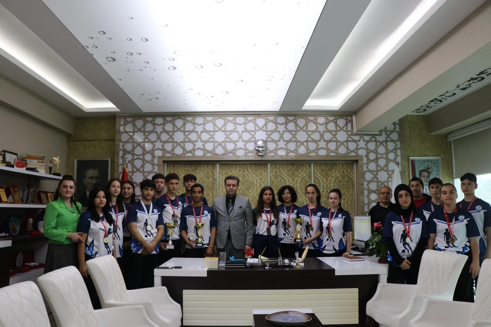 Yalova Milli Eğitim Müdürü Halil İbrahim Akmeşe, farklı spor dallarında başarılar elde etmiş Çiftlikköy Mustafa Kemal Anadolu Lisesi öğrencilerini makamında ağırladı. Ziyarette Çiftlikköy Mustafa Kemal Anadolu Lisesi Müdürü Selda Altan da hazır bulundu. Akmeşe, öğrencilerle gerçekleştirdiği sohbette spor, sanat ve akademi alanındaki gayretlerin daima destekleneceğini belirterek hepsini tek tek başarılarından dolayı kutladı. Gençlerin elde ettiği her başarı ile kendilerinin de mutlu olduklarını ve gururlandıklarını dile getiren Akmeşe, “Sizlerin elde ettiğiniz her başarı bizleri de mutlu ediyor. Farklı spor dallarında elde ettiğiniz bu önemli başarılar, bizlere büyük bir gurur kaynağı oluyor. Sporun sadece bedensel aktivite olmadığını, aynı zamanda bir disiplin ve azim göstergesi olduğunu da biliyoruz. Sizler, bu alandaki başarınızla sadece kendinize değil, tüm gençlerimize de ilham kaynağı oluyorsunuz. Eğitim-öğretim hayatınızda da gösterdiğiniz başarıları takdirle karşılıyorum. Biliyorum ki sizler, sadece sporda değil, akademik alanda da başarılı olmak için büyük çaba gösteriyorsunuz. Bu çabanızın karşılığını da en güzel şekilde alıyorsunuz. Başarılarınızın devamını diliyorum gelecekte de sizlerden daha güzel haberler bekliyoruz. Unutmayın ki sizler, bu ülkenin geleceğisiniz” dedi.