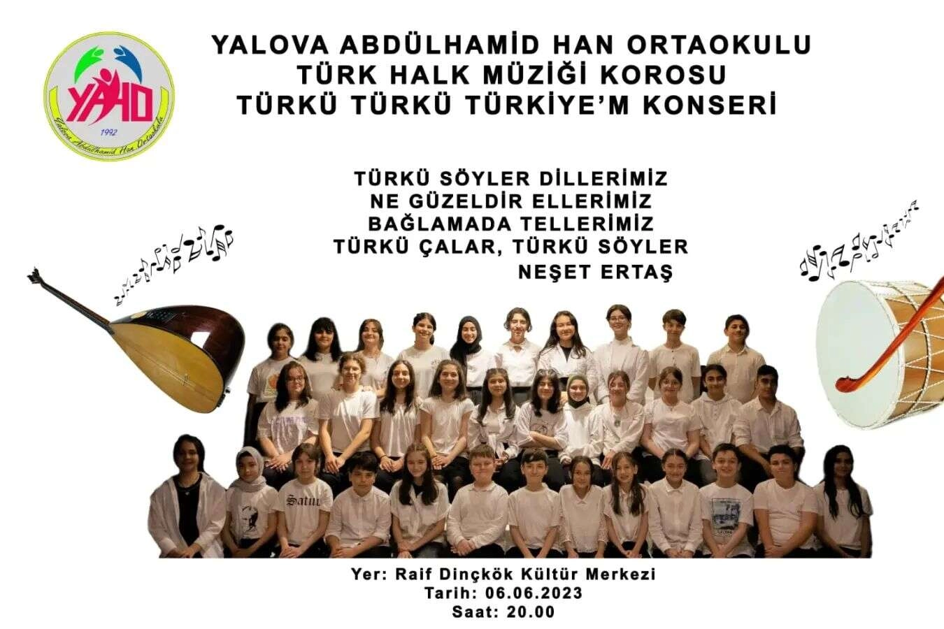 Yalova Abdülhamid Han Ortaokulu, bünyesindeki yetenekli öğrencilerden oluşan Türk Halk Müziği Korosu ile müzikseverlere unutulmaz bir deneyim sunmaya hazırlanıyor. 6 Haziran tarihinde gerçekleşecek olan "Türkü Türkü Türkiye'm" konseri için öğrenciler, yoğun bir çalışma temposuyla hazırlıklarını sürdürüyor.