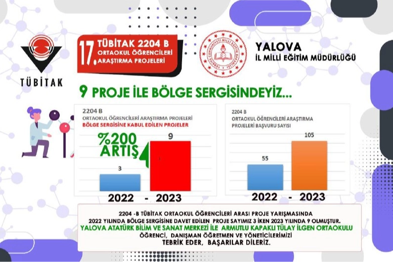 Yalova Milli Eğitim Müdürlüğü, 2204-B Ortaokul Öğrencileri Araştırma Projeleri Yarışması’nda öğrencilerin elde ettiği başarıyı duyurdu. Buna göre, Yalova’dan bölge sergisine davet edilen proje sayısı 2023 yılında yüzde 200 artarak 9’a yükseldi. Yalova Milli Eğitim Müdürlüğü yaptığı açıklamada, “2204-B Ortaokul Öğrencileri Araştırma Projeleri Yarışmasında öğrencilerimiz bilime iz bıraktı. 2022 yılında bölge sergisine davet edilen proje sayımız 3 iken 2023 yılında yüzde 200 artışla 9 oldu. Yalova Atatürk Bilim Sanat Merkezi ile Armutlu Tülay İlgen Ortaokulu öğrenci, danışman öğretmen ve yöneticilerini tebrik eder, başarılar dileriz” denildi.