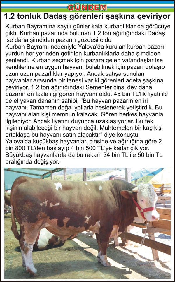 Kurban Bayramına sayılı günler kala kurbanlıklar da görücüye çıktı. Kurban pazarında bulunan 1.2 ton ağırlığındaki Dadaş ise daha şimdiden pazarın gözdesi oldu Kurban Bayramı nedeniyle Yalova'da kurulan kurban pazarı yurdun her yerinden getirilen kurbanlıklarla daha şimdiden şenlendi. Kurban seçmek için pazara gelen vatandaşlar ise kendilerine en uygun hayvanı bulabilmek için pazarı dolaşıp uzun uzun pazarlıklar yapıyor. Ancak satışa sunulan hayvanlar arasında bir tanesi var ki görenleri adeta şaşkına çeviriyor. 1.2 ton ağırlığındaki Sementer cinsi dev dana pazarın en fazla ilgi gören hayvanı oldu. 45 bin TL'lik fiyatı ile de el yakan dananın sahibi, "Bu hayvan pazarın en iri hayvanı. Tamamen doğal yollarla beslenerek yetiştirdik. Bu hayvanı alan kişi memnun kalacak. Gören herkes hayvanla ilgileniyor. Ancak fiyatını duyunca uzaklaşıyorlar. Bu tek kişinin alabileceği bir hayvan değil. Muhtemelen bir kaç kişi ortaklaşa bu hayvanı satın alacaktır" diye konuştu. Yalova’da küçükbaş hayvanlar, cinsine ve ağırlığına göre 2 bin 800 TL'den başlayıp 4 bin 500 TL'ye kadar çıkıyor. Büyükbaş hayvanlarda da bu rakam 34 bin TL ile 50 bin TL aralığında değişiyor.