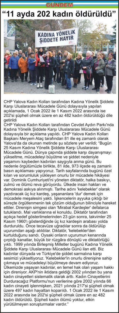 CHP Yalova Kadın Kolları tarafından Kadına Yönelik Şiddete Karşı Uluslararası Mücadele Günü dolayısıyla yapılan açıklamada, 1 Ocak 2022 ile 1 Kasım 2022 arasında ise 202'si şüpheli olmak üzere en az 482 kadın öldürüldüğü dile getirildi
