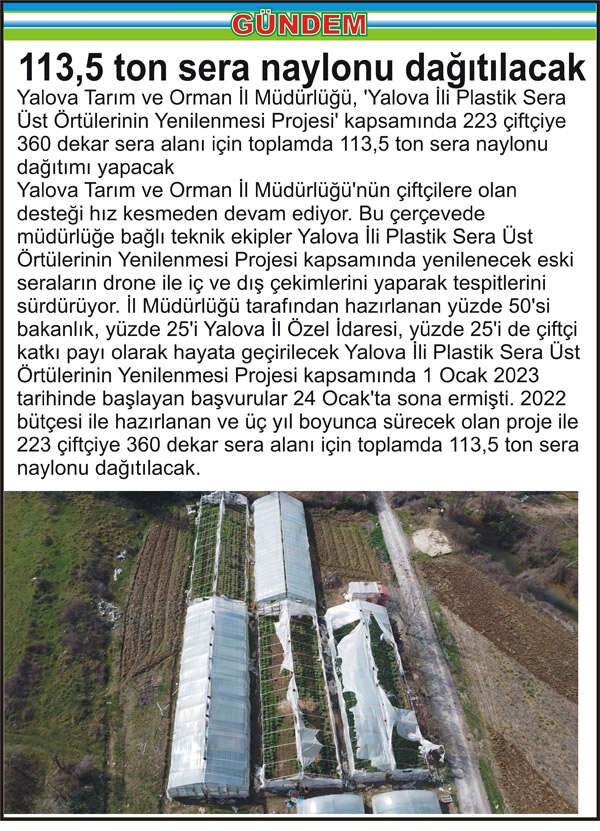 Yalova Tarım ve Orman İl Müdürlüğü, ‘Yalova İli Plastik Sera Üst Örtülerinin Yenilenmesi Projesi’ kapsamında 223 çiftçiye 360 dekar sera alanı için toplamda 113,5 ton sera naylonu dağıtımı yapacak
