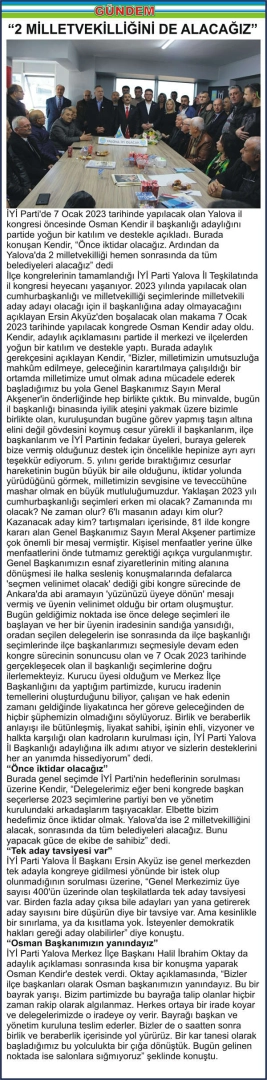 İYİ Parti’de 7 Ocak 2023 tarihinde yapılacak olan Yalova il kongresi öncesinde Osman Kendir il başkanlığı adaylığını partide yoğun bir katılım ve destekle açıkladı. Burada konuşan Kendir, “Önce iktidar olacağız. Ardından da Yalova’da 2 milletvekilliği hemen sonrasında da tüm belediyeleri alacağız” dedi