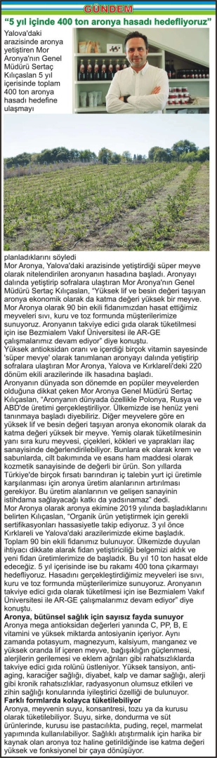 Yalova’daki arazisinde aronya yetiştiren Mor Aronya’nın Genel Müdürü Sertaç Kılıçaslan 5 yıl içerisinde toplam 400 ton aronya hasadı hedefine ulaşmayı planladıklarını söyledi Mor Aronya, Yalova’daki arazisinde yetiştirdiği süper meyve olarak nitelendirilen aronyanın hasadına başladı. Aronyayı dalında yetiştirip sofralara ulaştıran Mor Aronya’nın Genel Müdürü Sertaç Kılıçaslan, “Yüksek lif ve besin değeri taşıyan aronya ekonomik olarak da katma değeri yüksek bir meyve. Mor Aronya olarak 90 bin ekili fidanımızdan hasat ettiğimiz meyveleri sıvı, kuru ve toz formunda müşterilerimize sunuyoruz. Aronyanın takviye edici gıda olarak tüketilmesi için ise Bezmialem Vakıf Üniversitesi ile AR-GE çalışmalarımız devam ediyor” diye konuştu. Yüksek antioksidan oranı ve içerdiği birçok vitamin sayesinde ‘süper mevye’ olarak tanımlanan aronyayı dalında yetiştirip sofralara ulaştıran Mor Aronya, Yalova ve Kırklareli’deki 220 dönüm ekili arazilerinde ilk hasadına başladı. Aronyanın dünyada son dönemde en popüler meyvelerden olduğuna dikkat çeken Mor Aronya Genel Müdürü Sertaç Kılıçaslan, “Aronyanın dünyada özellikle Polonya, Rusya ve ABD’de üretimi gerçekleştiriliyor. Ülkemizde ise henüz yeni tanınmaya başladı diyebiliriz. Diğer meyvelere göre en yüksek lif ve besin değeri taşıyan aronya ekonomik olarak da katma değeri yüksek bir meyve. Yemiş olarak tüketilmesinin yanı sıra kuru meyvesi, çiçekleri, kökleri ve yaprakları ilaç sanayisinde değerlendirilebiliyor. Bunlara ek olarak krem ve sabunlarda, cilt bakımında ve esans ham maddesi olarak kozmetik sanayisinde de değerli bir ürün. Son yıllarda Türkiye'de birçok fırsatı barındıran iç talebin yurt içi üretimle karşılanması için aronya üretim alanlarının artırılması gerekiyor. Bu üretim alanlarının ve gelişen sanayinin istihdama sağlayacağı katkı da yadsınamaz” dedi. Mor Aronya olarak aronya ekimine 2019 yılında başladıklarını belirten Kılıçaslan, “Organik ürün yetiştirmek için gerekli sertifikasyonları hassasiyetle takip ediyoruz. 3 yıl önce Kırklareli ve Yalova’daki arazilerimizde ekime başladık. Toplam 90 bin ekili fidanımız bulunuyor. Ülkemizde duyulan ihtiyacı dikkate alarak fidan yetiştiriciliği belgemizi aldık ve yeni fidan üretimlerimize de başladık. Bu yıl 10 ton hasat elde edeceğiz. 5 yıl içerisinde ise bu rakamı 400 tona çıkarmayı hedefliyoruz. Hasadını gerçekleştirdiğimiz meyveleri ise sıvı, kuru ve toz formunda müşterilerimize sunuyoruz. Aronyanın takviye edici gıda olarak tüketilmesi için ise Bezmialem Vakıf Üniversitesi ile AR-GE çalışmalarımız devam ediyor” diye konuştu. Aronya, bütünsel sağlık için sayısız fayda sunuyor Aronya mega antioksidan değerleri yanında C, PP, B, E vitamini ve yüksek miktarda antosiyanin içeriyor. Aynı zamanda potasyum, magnezyum, kalsiyum, manganez ve yüksek oranda lif içeren meyve, bağışıklığın güçlenmesi, alerjilerin gerilemesi ve eklem ağrıları gibi rahatsızlıklarda takviye edici gıda rolünü üstleniyor. Yüksek tansiyon, anti-aging, karaciğer sağlığı, diyabet, kalp ve damar sağlığı, alerji gibi kronik rahatsızlıklar, radyasyonun olumsuz etkileri ve zihin sağlığı konularında iyileştirici özelliği de bulunuyor. Farklı formlarda kolayca tüketilebiliyor Aronya, meyvenin suyu, konsantresi, tozu ya da kurusu olarak tüketilebiliyor. Suyu, sirke, dondurma ve süt ürünlerinde, kurusu ise pastacılıkta, puding, reçel, marmelat yapımında kullanılabiliyor. Sağlıklı atıştırmalık için harika bir kaynak olan aronya toz haline getirildiğinde ise katma değeri yüksek ve fonksiyonel bir çaya dönüşüyor.