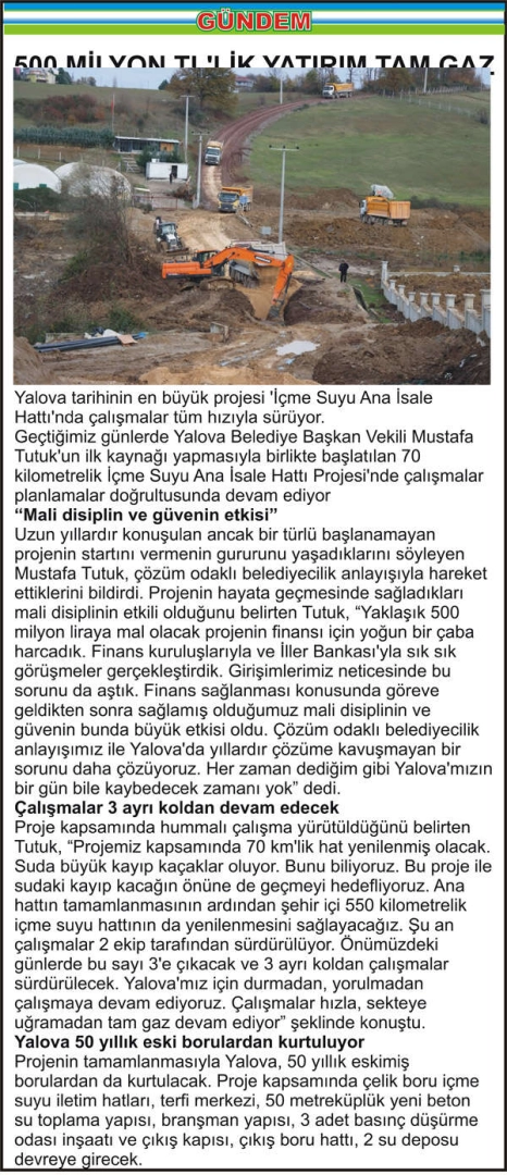 Yalova tarihinin en büyük projesi ‘İçme Suyu Ana İsale Hattı’nda çalışmalar tüm hızıyla sürüyor. Geçtiğimiz günlerde Yalova Belediye Başkan Vekili Mustafa Tutuk’un ilk kaynağı yapmasıyla birlikte başlatılan 70 kilometrelik İçme Suyu Ana İsale Hattı Projesi’nde çalışmalar planlamalar doğrultusunda devam ediyor “Mali disiplin ve güvenin etkisi” Uzun yıllardır konuşulan ancak bir türlü başlanamayan projenin startını vermenin gururunu yaşadıklarını söyleyen Mustafa Tutuk, çözüm odaklı belediyecilik anlayışıyla hareket ettiklerini bildirdi. Projenin hayata geçmesinde sağladıkları mali disiplinin etkili olduğunu belirten Tutuk, “Yaklaşık 500 milyon liraya mal olacak projenin finansı için yoğun bir çaba harcadık. Finans kuruluşlarıyla ve İller Bankası’yla sık sık görüşmeler gerçekleştirdik. Girişimlerimiz neticesinde bu sorunu da aştık. Finans sağlanması konusunda göreve geldikten sonra sağlamış olduğumuz mali disiplinin ve güvenin bunda büyük etkisi oldu. Çözüm odaklı belediyecilik anlayışımız ile Yalova’da yıllardır çözüme kavuşmayan bir sorunu daha çözüyoruz. Her zaman dediğim gibi Yalova’mızın bir gün bile kaybedecek zamanı yok” dedi. Çalışmalar 3 ayrı koldan devam edecek Proje kapsamında hummalı çalışma yürütüldüğünü belirten Tutuk, “Projemiz kapsamında 70 km’lik hat yenilenmiş olacak. Suda büyük kayıp kaçaklar oluyor. Bunu biliyoruz. Bu proje ile sudaki kayıp kacağın önüne de geçmeyi hedefliyoruz. Ana hattın tamamlanmasının ardından şehir içi 550 kilometrelik içme suyu hattının da yenilenmesini sağlayacağız. Şu an çalışmalar 2 ekip tarafından sürdürülüyor. Önümüzdeki günlerde bu sayı 3’e çıkacak ve 3 ayrı koldan çalışmalar sürdürülecek. Yalova’mız için durmadan, yorulmadan çalışmaya devam ediyoruz. Çalışmalar hızla, sekteye uğramadan tam gaz devam ediyor” şeklinde konuştu. Yalova 50 yıllık eski borulardan kurtuluyor Projenin tamamlanmasıyla Yalova, 50 yıllık eskimiş borulardan da kurtulacak. Proje kapsamında çelik boru içme suyu iletim hatları, terfi merkezi, 50 metreküplük yeni beton su toplama yapısı, branşman yapısı, 3 adet basınç düşürme odası inşaatı ve çıkış kapısı, çıkış boru hattı, 2 su deposu devreye girecek.