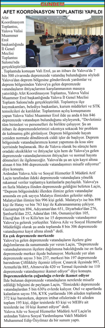 Afet Koordinasyon Toplantısı, Yalova Valisi Muammer Erol başkanlığında İl Genel Meclisi Toplantısı Salonu’nda gerçekleştirildi. Toplantıda konuşan Vali Erol, şu an itibarı ile Yalova’da 7 bin 500 civarında depremzede vatandaş bulunduğunu söyledi