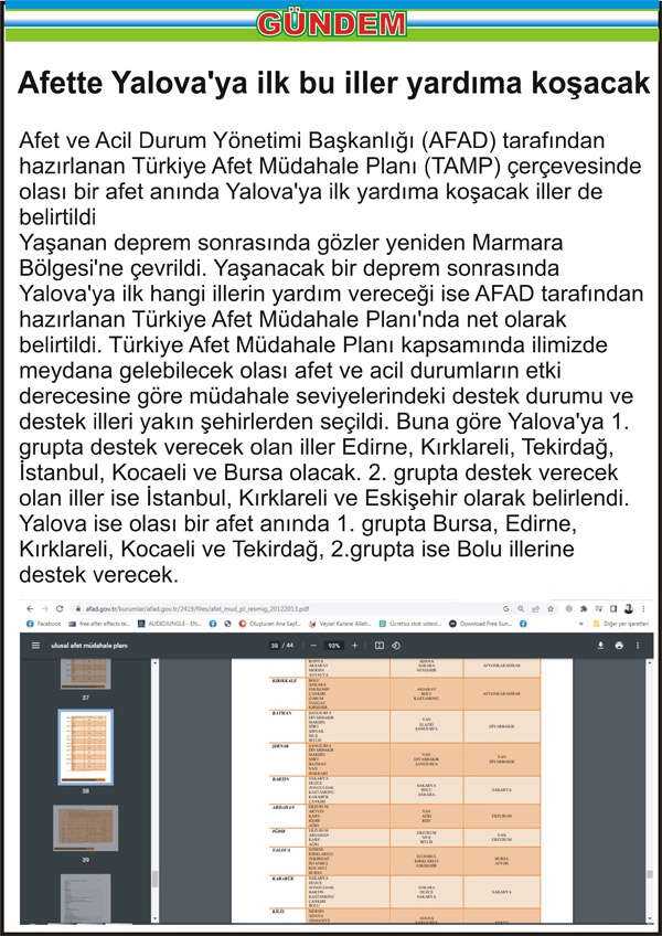 Afet ve Acil Durum Yönetimi Başkanlığı (AFAD) tarafından hazırlanan Türkiye Afet Müdahale Planı (TAMP) çerçevesinde olası bir afet anında Yalova’ya ilk yardıma koşacak iller de belirtildi Yaşanan deprem sonrasında gözler yeniden Marmara Bölgesi’ne çevrildi. Yaşanacak bir deprem sonrasında Yalova’ya ilk hangi illerin yardım vereceği ise AFAD tarafından hazırlanan Türkiye Afet Müdahale Planı’nda net olarak belirtildi. Türkiye Afet Müdahale Planı kapsamında ilimizde meydana gelebilecek olası afet ve acil durumların etki derecesine göre müdahale seviyelerindeki destek durumu ve destek illeri yakın şehirlerden seçildi. Buna göre Yalova’ya 1. grupta destek verecek olan iller Edirne, Kırklareli, Tekirdağ, İstanbul, Kocaeli ve Bursa olacak. 2. grupta destek verecek olan iller ise İstanbul, Kırklareli ve Eskişehir olarak belirlendi. Yalova ise olası bir afet anında 1. grupta Bursa, Edirne, Kırklareli, Kocaeli ve Tekirdağ, 2.grupta ise Bolu illerine destek verecek.