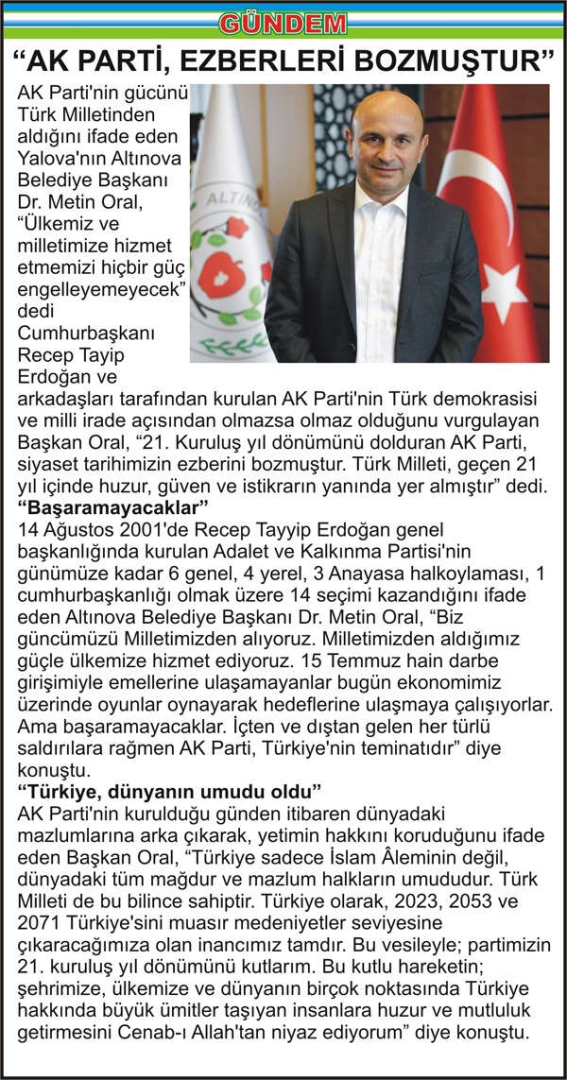 AK Parti’nin gücünü Türk Milletinden aldığını ifade eden Yalova’nın Altınova Belediye Başkanı Dr. Metin Oral, “Ülkemiz ve milletimize hizmet etmemizi hiçbir güç engelleyemeyecek” dedi Cumhurbaşkanı Recep Tayip Erdoğan ve arkadaşları tarafından kurulan AK Parti’nin Türk demokrasisi ve milli irade açısından olmazsa olmaz olduğunu vurgulayan Başkan Oral, “21. Kuruluş yıl dönümünü dolduran AK Parti, siyaset tarihimizin ezberini bozmuştur. Türk Milleti, geçen 21 yıl içinde huzur, güven ve istikrarın yanında yer almıştır” dedi. “Başaramayacaklar” 14 Ağustos 2001’de Recep Tayyip Erdoğan genel başkanlığında kurulan Adalet ve Kalkınma Partisi’nin günümüze kadar 6 genel, 4 yerel, 3 Anayasa halkoylaması, 1 cumhurbaşkanlığı olmak üzere 14 seçimi kazandığını ifade eden Altınova Belediye Başkanı Dr. Metin Oral, “Biz güncümüzü Milletimizden alıyoruz. Milletimizden aldığımız güçle ülkemize hizmet ediyoruz. 15 Temmuz hain darbe girişimiyle emellerine ulaşamayanlar bugün ekonomimiz üzerinde oyunlar oynayarak hedeflerine ulaşmaya çalışıyorlar. Ama başaramayacaklar. İçten ve dıştan gelen her türlü saldırılara rağmen AK Parti, Türkiye’nin teminatıdır” diye konuştu. “Türkiye, dünyanın umudu oldu” AK Parti’nin kurulduğu günden itibaren dünyadaki mazlumlarına arka çıkarak, yetimin hakkını koruduğunu ifade eden Başkan Oral, “Türkiye sadece İslam Âleminin değil, dünyadaki tüm mağdur ve mazlum halkların umududur. Türk Milleti de bu bilince sahiptir. Türkiye olarak, 2023, 2053 ve 2071 Türkiye’sini muasır medeniyetler seviyesine çıkaracağımıza olan inancımız tamdır. Bu vesileyle; partimizin 21. kuruluş yıl dönümünü kutlarım. Bu kutlu hareketin; şehrimize, ülkemize ve dünyanın birçok noktasında Türkiye hakkında büyük ümitler taşıyan insanlara huzur ve mutluluk getirmesini Cenab-ı Allah’tan niyaz ediyorum” diye konuştu.