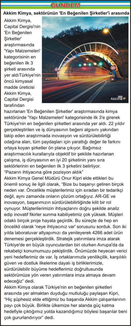 Akkim Kimya, Capital Dergisi’nin ‘En Beğenilen Şirketler’ araştırmasında ‘Yapı Malzemeleri’ kategorisinin en beğenilen ilk 3 şirketi arasında yer aldıTürkiye’nin öncü kimyasal madde üreticisi Akkim Kimya, Capital Dergisi tarafından hazırlanan ‘En Beğenilen Şirketler’ araştırmasında kimya sektöründe ‘Yapı Malzemeleri’ kategorisinde ilk 3’e girerek Türkiye’nin en beğenilen şirketleri arasında yer aldı. 22 yıldır gerçekleştirilen ve iş dünyasının beğeni algısını yakından takip eden araştırmada inovasyon ve sürdürülebilirliği odağına alan, tüm paydaşları için yarattığı değer ile farkını ortaya koyan şirketler ön plana çıkıyor. Bağımsız araştırmacılık kurallarıyla objektif bir şekilde hazırlanan çalışma, iş dünyasının en iyi 20 şirketinin yanı sıra sektörlerinin en beğenilen ilk 3 şirketini belirliyor.