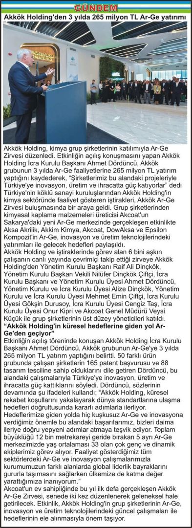 Akkök Holding, kimya grup şirketlerinin katılımıyla Ar-Ge Zirvesi düzenledi. Etkinliğin açılış konuşmasını yapan Akkök Holding İcra Kurulu Başkanı Ahmet Dördüncü, Akkök grubunun 3 yılda Ar-Ge faaliyetlerine 265 milyon TL yatırım yaptığını kaydederek, “Şirketlerimiz bu alandaki projeleriyle Türkiye’ye inovasyon, üretim ve ihracatta güç katıyorlar” dedi