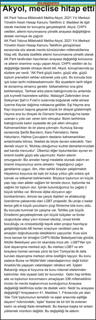 AK Parti Yalova Milletvekili Meliha Akyol, 2021 Yılı Merkezi Yönetim Kesin Hesap Kanunu Teklifinin 2. Maddesi ile ilgili olarak mecliste bir konuşma gerçekleştirdi. Akyol, CHP’li vekilleri, ailenin korunmasına yönelik anayasa değişikliğine destek vermeye de çağırdı AK Parti Yalova Milletvekili Meliha Akyol, 2021 Yılı Merkezi Yönetim Kesin Hesap Kanunu Teklifinin görüşülmesi esnasında söz alarak meclis kürsüsünden milletvekillerine hitap etti. Burada özellikle ailenin korunmasına yönelik olarak AK Parti tarafından hazırlanan anayasa değişikliği konusuna ve ailenin önemine vurgu yapan Akyol, CHP’li vekilleri de bu değişikliğe destek olmaya davet etti. Akyol, konuşmasında şu sözlere yer verdi; “AK Parti güçlü kadın, güçlü aile, güçlü toplum prensibini rehber edinerek yola çıktı. Bu konuda bize ışık tutan tarihi müktesebatımızdır. Biz siyasilerin tarih bilgisi ile donanmış olmamız gerekir. İstikametimizi ona göre belirlemeliyiz. Tarihsel arka plana baktığımızda bu anlamda çok kıymetli hazinelere sahibiz. Malazgirt Zaferinden önce Süleyman Şah’ın Fırat’ın sularında boğularak vefat etmesi üzerine Kayılar dağılma noktasına geldiler. Eşi Hayme ana Kayı boyunun başına geçerek büyük bir dirayet göstermiştir. Hayme ana bu dirayeti ile Osmanlı İmparatorluğu’na kadar uzanan o yola can veren isim olmuştur. Bizim tarihimize baktığımızda kadın siyasette de çok etkin olmuştur. Kahramanlıkları ile ön plana çıkmıştır. Kurtuluş Savaşı esnasında Şerife Bacıların, Kara Fatmaların, Nene Hatunların, Halime Çavuşların destansı kahramanlıkları anlatılmakla bitmez. İlelebet de böyle devam edecektir. Yani demek oluyor ki, ‘Muhtaç olduğumuz kudret damarlarımızdaki asil kanda mevcuttur’. Ülkemizi diğer toplumlardan ayıran en önemli özellik güçlü aile yapımızdır. Kadın ailenin omurgasıdır. Biz anneler hangi meslekte olursak olalım en önemli misyonumuz anne olmaktır. Yaşadığımız çağın gereklerine uygun, ilim, irfan sahibi bireyler yetiştirmektir. Hayatımız boyunca da tıpkı bir kutup yıldızı gibi onlara ışık tutmak ve istikamet belirlemektir. Böylece toplumun en küçük yapı taşı olan aileler sağlam bir temele oturur, toplumlar da sağlıklı bir toplum olur. İçinde bulunduğumuz bu çağda 2 büyük tehlike var. Birincisi dijital dünyanın ağır bombardımanı, ikincisi ise çarpık ilişkileri ve ahlaksızlığı özendirme çabasında olan LGBT projesidir. Bu proje o kadar ileriye gitti ki küçük çocukların çizgi filmlerine bile konu oldu. Bu konuda hummalı bir çalışma var. Tehlike çok büyük. Emellerini gerçekleştirmek için büyük bütçeler ve fonlar oluşturdular aileyi yıkın küresel ideoloji, cinsel kimlik bozukluğu ve cinsiyetsizliği teşvik eden projeyi hazırlayıp geliştirdiğinizde AB hemen onaylıyor verdikleri para ile amaçları doğrultusunda istediklerini yapıyorlar. Kısa süre önce benzer bir örneğini CHP’li Nilüfer Belediyesi’nde gördük. Nilüfer Belediyesi yeni bir skandala imza attı. LGBT’liler için özel dayanışma merkezi açtı. Bu merkez LGBT ve artı bireylere hizmet vermesi yönü ile tüm Türkiye’de ilk defa kurulan dayanışma merkezi olma özelliğini taşıyor. Bu konu sadece Bursa ve Nilüfer’deki vatandaşlarımızı değil bütün Anadolu’da yaşayan vatandaşları rahatsız etti. İçişleri Bakanlığı olaya el koyunca da bunu internet sitelerinden kaldırdılar. Aile siyaset üstü bir kurumdur. Gelin hep birlikte aile ve toplumun korunmasını amaçlayan 336 milletvekilinin imzası ile meclis başkanımıza sunduğumuz Anayasa değişikliği teklifimize sizler de destek verin. Nedir bu anayasa değişikliği? Anayasanın 41. Maddesi 1. Fıkrasında yer alan ‘Aile Türk toplumunun temelidir ve eşler arasında eşitliğe dayanır’ hükmündeki, ‘eşler’ ibaresi de bir biri ile evlenen kadın ve erkeği ifade etmektedir. Bu ibareye başka bir anlam yüklemek mümkün değildir. Bu değişikliği ile ailenin korunması için ilave anayasa güvencesi sağlanmış olacaktır.”