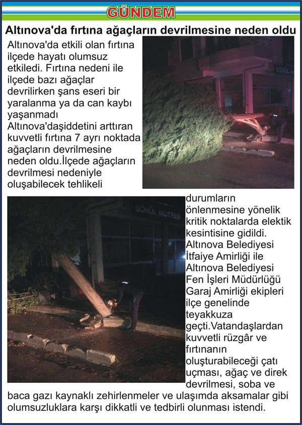 Altınova’da etkili olan fırtına ilçede hayatı olumsuz etkiledi. Fırtına nedeni ile ilçede bazı ağaçlar devrilirken şans eseri bir yaralanma ya da can kaybı yaşanmadı Altınova’daşiddetini arttıran kuvvetli fırtına 7 ayrı noktada ağaçların devrilmesine neden oldu.İlçede ağaçların devrilmesi nedeniyle oluşabilecek tehlikeli durumların önlenmesine yönelik kritik noktalarda elektik kesintisine gidildi. Altınova Belediyesi İtfaiye Amirliği ile Altınova Belediyesi Fen İşleri Müdürlüğü Garaj Amirliği ekipleri ilçe genelinde teyakkuza geçti.Vatandaşlardan kuvvetli rüzgâr ve fırtınanın oluşturabileceği çatı uçması, ağaç ve direk devrilmesi, soba ve baca gazı kaynaklı zehirlenmeler ve ulaşımda aksamalar gibi olumsuzluklara karşı dikkatli ve tedbirli olunması istendi.