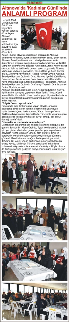 Altınova’da ‘Kadınlar Günü’nde anlamlı program Her yıl 8 Mart Dünya Kadınlar Günü’nde bayanlara yönelik eğlence düzenleyen Altınova Belediyesi, bu sene şehitlerimiz için mevlit ve dualı bir etkinlik düzenledi. Kuran-ı Kerim tilaveti ile başlayan programda Altınova Belediyesi’nce pilav, ayran ve lokum ikram edilip, çiçek verildi. Altınova Belediyesi tarafından belediye binası 4. katta düzenlenen program saygı duruşunda bulunulması ve İstiklal Marşı'nın okunmasıyla başladı. Ardından Kuran-ı Kerim tilaveti okundu. İlahi ve tekbirlerle devam eden programda Altınova Müftülüğü kadın din görevlileri, Yasin-i Şerif ve Fetih Suresi okudu. Altınova Kaymakamı Regaip Ahmet Özyiğit, Altınova Belediye Başkanı Dr. Metin Oral, Altınova İlçe Müftüsü Recep Eren ve Hacı Tevfik Yılmaz Cami İmam Hatibi Kemalettin Kaya programa kısa süreliğine katıldılar. Programda, Altınova Belediye Başkanı Dr. Metin Oral’ın eşi Yasemin Oral ile annesi Emine Oral da yer aldı. Altınova İlçe Müftüsü Recep Eren, ‘İslam’da Kadının Yeri’yle ilgili kısa bir konuşma yaparken, Hacı Tevfik Yılmaz Cami İmam Hatibi Kemalettin Kaya da dua yaptı. İlçedeki kadınların büyük ilgi gösterdiği programda zaman zaman duygu dolu anlar yaşandı. “Büyük önem taşımaktadır” Programda kısa bir konuşma yapan Özyiğit, annesini kaybetmiş birisi olarak kadının önemini en iyi anlayan kişilerden olduğunu ifade ederek, “Kadın İslamiyet’te ve Türklerde büyük önem taşımaktadır. Türkiye’de yaşanan güzel gelişmelerde kadınlarımızın çok büyük emeği, çok büyük desteği vardır” dedi. “Ümmetin ve mazlumların umuduyuz” Düzenlenen programın çok anlamlı ve önemli olduğunu dile getiren Başkan Dr. Metin Oral da, “İçten ve dıştan bizi yıkmak için şer güçler ellerinden geleni yaptılar, yapmaya devam ediyorlar. Ancak ümmetin umudu olan Türkiye, birlik ve beraberlik içerisinde neler yapabileceğini dosta düşmana gösterdi. Kendi silahını, uçağını, helikopterini, gemisini, İHA’sını, SİHA’sını yapan Türk insanı neler yapabileceğini ortaya koydu. Millileşen Türkiye, artık kendi imkânlarını kullanarak düşmanla mücadelesini sürdürüyor. Böyle olunca da Türkiye ilerliyor, gelişiyor, dünya mazlumuna umut oluyor” diye konuştu.