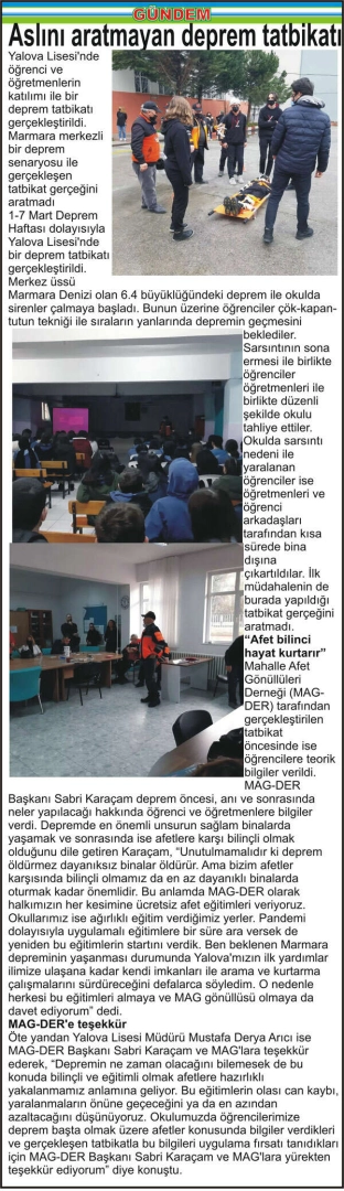Yalova Lisesi’nde öğrenci ve öğretmenlerin katılımı ile bir deprem tatbikatı gerçekleştirildi. Marmara merkezli bir deprem senaryosu ile gerçekleşen tatbikat gerçeğini aratmadı 1-7 Mart Deprem Haftası dolayısıyla Yalova Lisesi’nde bir deprem tatbikatı gerçekleştirildi. Merkez üssü Marmara Denizi olan 6.4 büyüklüğündeki deprem ile okulda sirenler çalmaya başladı. Bunun üzerine öğrenciler çök-kapan-tutun tekniği ile sıraların yanlarında depremin geçmesini beklediler. Sarsıntının sona ermesi ile birlikte öğrenciler öğretmenleri ile birlikte düzenli şekilde okulu tahliye ettiler. Okulda sarsıntı nedeni ile yaralanan öğrenciler ise öğretmenleri ve öğrenci arkadaşları tarafından kısa sürede bina dışına çıkartıldılar. İlk müdahalenin de burada yapıldığı tatbikat gerçeğini aratmadı. “Afet bilinci hayat kurtarır” Mahalle Afet Gönüllüleri Derneği (MAG-DER) tarafından gerçekleştirilen tatbikat öncesinde ise öğrencilere teorik bilgiler verildi. MAG-DER Başkanı Sabri Karaçam deprem öncesi, anı ve sonrasında neler yapılacağı hakkında öğrenci ve öğretmenlere bilgiler verdi. Depremde en önemli unsurun sağlam binalarda yaşamak ve sonrasında ise afetlere karşı bilinçli olmak olduğunu dile getiren Karaçam, “Unutulmamalıdır ki deprem öldürmez dayanıksız binalar öldürür. Ama bizim afetler karşısında bilinçli olmamız da en az dayanıklı binalarda oturmak kadar önemlidir. Bu anlamda MAG-DER olarak halkımızın her kesimine ücretsiz afet eğitimleri veriyoruz. Okullarımız ise ağırlıklı eğitim verdiğimiz yerler. Pandemi dolayısıyla uygulamalı eğitimlere bir süre ara versek de yeniden bu eğitimlerin startını verdik. Ben beklenen Marmara depreminin yaşanması durumunda Yalova’mızın ilk yardımlar ilimize ulaşana kadar kendi imkanları ile arama ve kurtarma çalışmalarını sürdüreceğini defalarca söyledim. O nedenle herkesi bu eğitimleri almaya ve MAG gönüllüsü olmaya da davet ediyorum” dedi. MAG-DER’e teşekkür Öte yandan Yalova Lisesi Müdürü Mustafa Derya Arıcı ise MAG-DER Başkanı Sabri Karaçam ve MAG’lara teşekkür ederek, “Depremin ne zaman olacağını bilemesek de bu konuda bilinçli ve eğitimli olmak afetlere hazırlıklı yakalanmamız anlamına geliyor. Bu eğitimlerin olası can kaybı, yaralanmaların önüne geçeceğini ya da en azından azaltacağını düşünüyoruz. Okulumuzda öğrencilerimize deprem başta olmak üzere afetler konusunda bilgiler verdikleri ve gerçekleşen tatbikatla bu bilgileri uygulama fırsatı tanıdıkları için MAG-DER Başkanı Sabri Karaçam ve MAG’lara yürekten teşekkür ediyorum” diye konuştu.