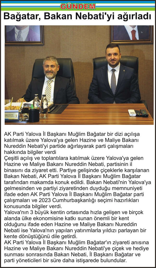 AK Parti Yalova İl Başkanı Muğlim Bağatar bir dizi açılışa katılmak üzere Yalova’ya gelen Hazine ve Maliye Bakanı Nureddin Nebati’yi partide ağırlayarak parti çalışmaları hakkında bilgiler verdi