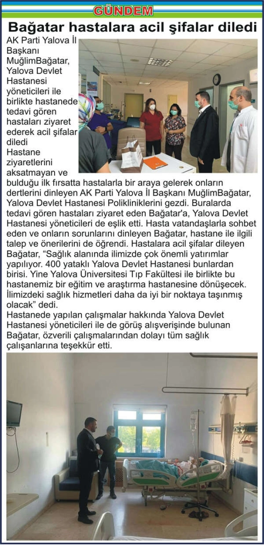 AK Parti Yalova İl Başkanı MuğlimBağatar, Yalova Devlet Hastanesi yöneticileri ile birlikte hastanede tedavi gören hastaları ziyaret ederek acil şifalar diledi