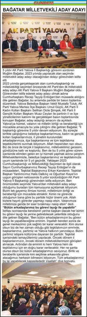 5 yıldır AK Parti Yalova İl Başkanlığı görevini sürdüren Muğlim Bağatar, 2023 yılında yapılacak olan seçimde milletvekili aday adayı olacağından dolayı görevinden istifa etti