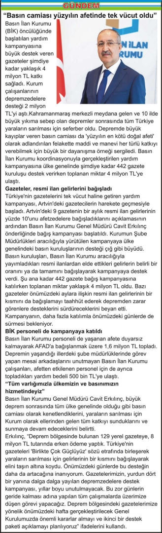 Basın İlan Kurumu (BİK) öncülüğünde başlatılan yardım kampanyasına büyük destek veren gazeteler şimdiye kadar yaklaşık 4 milyon TL katkı sağladı. Kurum çalışanlarının depremzedelere desteği 2 milyon TL’yi aştı.Kahramanmaraş merkezli meydana gelen ve 10 ilde büyük yıkıma sebep olan depremler sonrasında tüm Türkiye yaraların sarılması için seferber oldu. Depremde büyük kayıplar veren basın camiası da ‘yüzyılın en kötü doğal afeti’ olarak adlandırılan felakette maddi ve manevi her türlü katkıyı verebilmek için büyük bir dayanışma örneği sergiledi. Basın İlan Kurumu koordinasyonuyla gerçekleştirilen yardım kampanyasına ülke genelinde şimdiye kadar 442 gazete kuruluşu destek verirken toplanan miktar 4 milyon TL’ye ulaştı. Gazeteler, resmi ilan gelirlerini bağışladı Türkiye’nin gazetelerini tek vücut haline getiren yardım kampanyası, Artvin’deki gazetecilerin harekete geçmesiyle başladı. Artvin’deki 9 gazetenin bir aylık resmi ilan gelirlerinin yüzde 10’unu afetzedelere bağışladıklarını açıklamasının ardından Basın İlan Kurumu Genel Müdürü Cavit Erkılınç önderliğinde bağış kampanyası başlatıldı. Kurumun Şube Müdürlükleri aracılığıyla yürütülen kampanyaya ülke genelindeki basın kuruluşlarının desteği çığ gibi büyüdü. Basın kuruluşları, Basın İlan Kurumu aracılığıyla yayımladıkları resmi ilanlardan elde ettikleri gelirlerin belirli bir oranını ya da tamamını bağışlayarak kampanyaya destek verdi. Şu ana kadar 442 gazete bağış kampanyasına katılırken toplanan miktar yaklaşık 4 milyon TL oldu. Bazı gazeteler önümüzdeki aylara ilişkin resmi ilan gelirlerinin bir kısmını da bağışlamayı taahhüt ederek depremden zarar görenlere desteklerini sürdüreceklerini beyan etti. Kampanyanın, daha fazla katılımla önümüzdeki günlerde de sürmesi bekleniyor. BİK personeli de kampanyaya katıldı Basın İlan Kurumu personeli de yaşanan afete duyarsız kalmayarak AFAD’a bağışlanmak üzere 1,6 milyon TL topladı. Depremin yaşandığı illerdeki şube müdürlüklerinde görev yapan mesai arkadaşlarını unutmayan Basın İlan Kurumu çalışanları, afetten etkilenen personel için de ayrıca topladıkları yardım bedeli 500 bin TL’ye ulaştı. “Tüm varlığımızla ülkemizin ve basınımızın hizmetindeyiz” Basın İlan Kurumu Genel Müdürü Cavit Erkılınç, büyük deprem sonrasında tüm ülke genelinde olduğu gibi basın camiası olarak kenetlendiklerini, yaraların sarılması için Kurum olarak ellerinden gelen tüm katkıyı sunduklarını ve sunmaya devam edeceklerini belirtti. Erkılınç, “Deprem bölgesinde bulunan 129 yerel gazeteye, 8 milyon TL tutarında erken ödeme yaptık. Türkiye’nin gazeteleri ‘Birlikte Çok Güçlüyüz’ sözü etrafında birleşerek yaraların sarılması için gelirlerinin bir kısmını bağışlayarak elini taşın altına koydu. Önümüzdeki günlerde bu desteğin daha da artacağına inanıyorum. Gazetelerimizin, yurdun dört bir yanına dalga dalga yayılan depremzedelere destek kampanyası, yıllar boyu unutulmayacak. Bu zor günlerin geride kalması adına yapılan tüm çalışmalarda üzerimize düşen görevi yapacağız. Deprem bölgesindeki gazetelerimize yönelik önümüzdeki hafta gerçekleştirilecek Genel Kurulumuzda önemli kararlar almayı ve ikinci bir destek paketi açıklamayı planlıyoruz” ifadelerini kullandı.