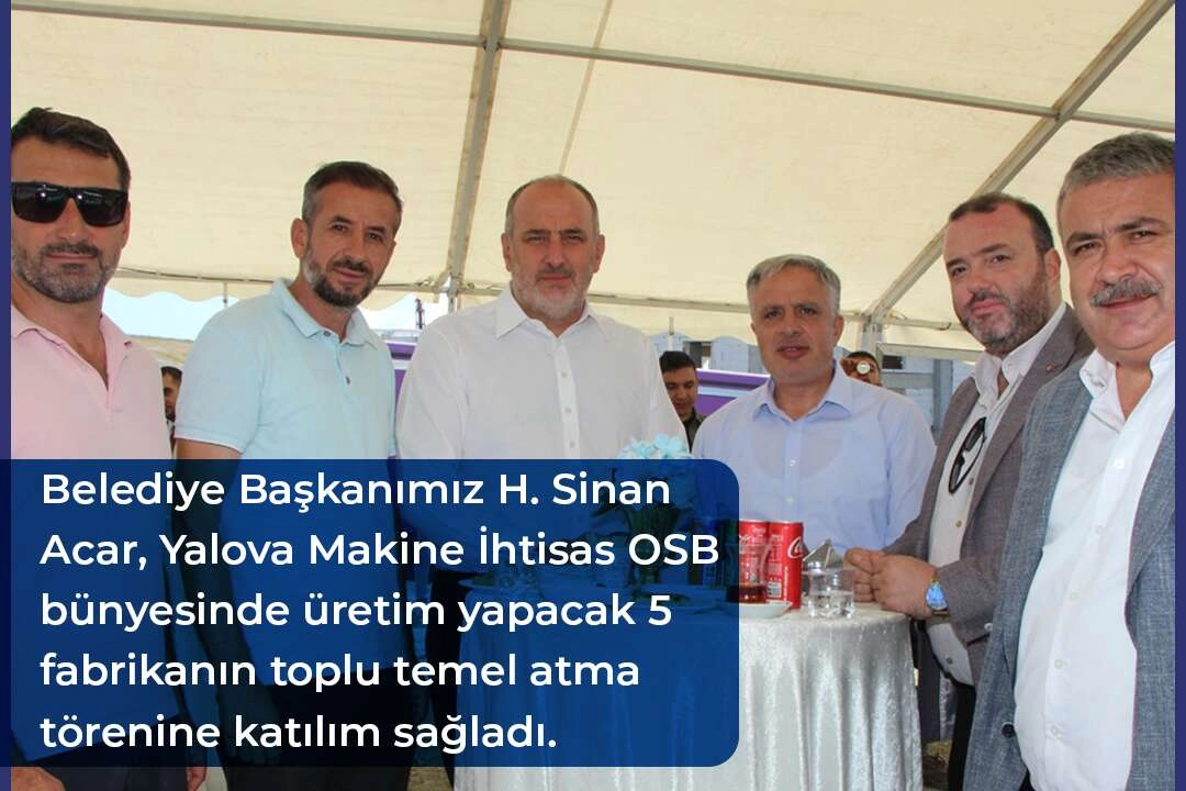 Termal Belediye Başkanı H. Sinan Acar, Çınarcık Belediye Başkanı Numan Soyer ve Yalova Esnaf Sanatkarları Odası (YESO) Başkanı Necati Erbul, Yalova Makine İhtisas OSB bünyesinde üretim yapacak 5 fabrikanın toplu temel atma törenine katılım sağladı. Bir araya gelen başkanlar Yalova için yapılan faaliyetler ile ilgili hayırlı olsun dileklerinde bulundu.