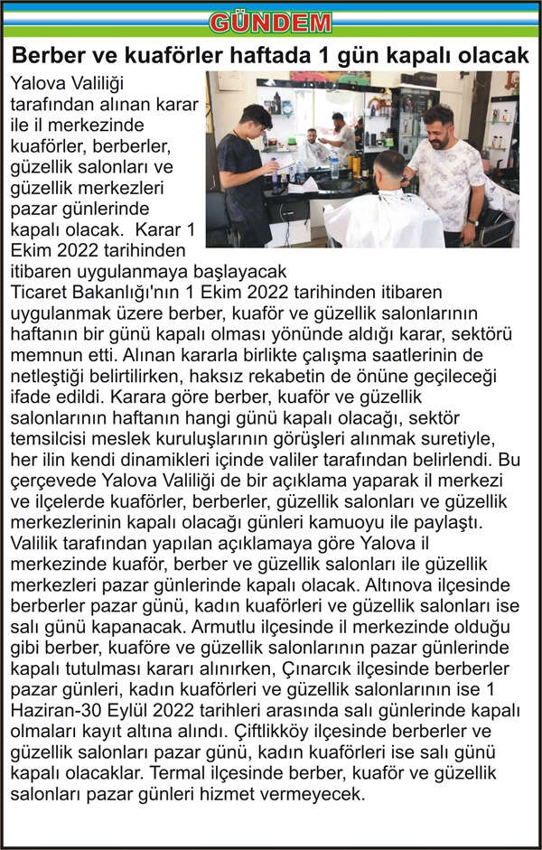 Yalova Valiliği tarafından alınan karar ile il merkezinde kuaförler, berberler, güzellik salonları ve güzellik merkezleri pazar günlerinde kapalı olacak. Karar 1 Ekim 2022 tarihinden itibaren uygulanmaya başlayacak