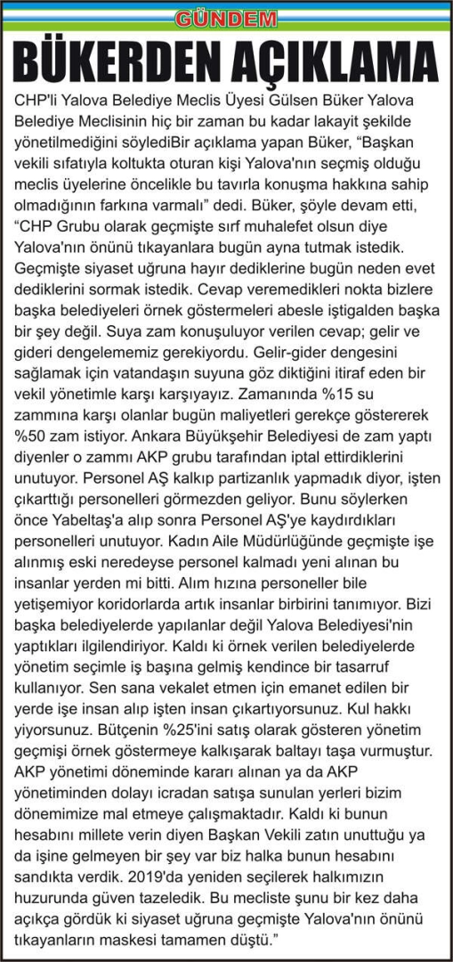 CHP’li Yalova Belediye Meclis Üyesi Gülsen Büker Yalova Belediye Meclisinin hiç bir zaman bu kadar lakayit şekilde yönetilmediğini söylediBir açıklama yapan Büker, “Başkan vekili sıfatıyla koltukta oturan kişi Yalova’nın seçmiş olduğu meclis üyelerine öncelikle bu tavırla konuşma hakkına sahip olmadığının farkına varmalı” dedi. Büker, şöyle devam etti, “CHP Grubu olarak geçmişte sırf muhalefet olsun diye Yalova’nın önünü tıkayanlara bugün ayna tutmak istedik. Geçmişte siyaset uğruna hayır dediklerine bugün neden evet dediklerini sormak istedik. Cevap veremedikleri nokta bizlere başka belediyeleri örnek göstermeleri abesle iştigalden başka bir şey değil. Suya zam konuşuluyor verilen cevap; gelir ve gideri dengelememiz gerekiyordu. Gelir-gider dengesini sağlamak için vatandaşın suyuna göz diktiğini itiraf eden bir vekil yönetimle karşı karşıyayız. Zamanında %15 su zammına karşı olanlar bugün maliyetleri gerekçe göstererek %50 zam istiyor. Ankara Büyükşehir Belediyesi de zam yaptı diyenler o zammı AKP grubu tarafından iptal ettirdiklerini unutuyor. Personel AŞ kalkıp partizanlık yapmadık diyor, işten çıkarttığı personelleri görmezden geliyor. Bunu söylerken önce Yabeltaş’a alıp sonra Personel AŞ’ye kaydırdıkları personelleri unutuyor. Kadın Aile Müdürlüğünde geçmişte işe alınmış eski neredeyse personel kalmadı yeni alınan bu insanlar yerden mi bitti. Alım hızına personeller bile yetişemiyor koridorlarda artık insanlar birbirini tanımıyor. Bizi başka belediyelerde yapılanlar değil Yalova Belediyesi’nin yaptıkları ilgilendiriyor. Kaldı ki örnek verilen belediyelerde yönetim seçimle iş başına gelmiş kendince bir tasarruf kullanıyor. Sen sana vekalet etmen için emanet edilen bir yerde işe insan alıp işten insan çıkartıyorsunuz. Kul hakkı yiyorsunuz. Bütçenin %25’ini satış olarak gösteren yönetim geçmişi örnek göstermeye kalkışarak baltayı taşa vurmuştur. AKP yönetimi döneminde kararı alınan ya da AKP yönetiminden dolayı icradan satışa sunulan yerleri bizim dönemimize mal etmeye çalışmaktadır. Kaldı ki bunun hesabını millete verin diyen Başkan Vekili zatın unuttuğu ya da işine gelmeyen bir şey var biz halka bunun hesabını sandıkta verdik. 2019’da yeniden seçilerek halkımızın huzurunda güven tazeledik. Bu mecliste şunu bir kez daha açıkça gördük ki siyaset uğruna geçmişte Yalova’nın önünü tıkayanların maskesi tamamen düştü.”