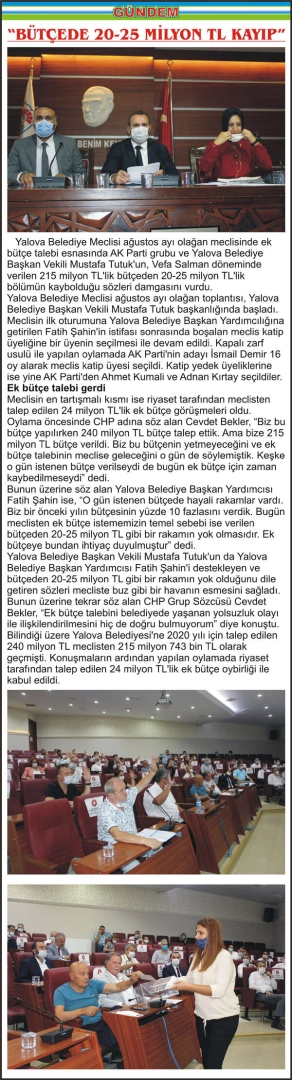 “BÜTÇEDE 20-25 MİLYON TL KAYIP” Yalova Belediye Meclisi ağustos ayı olağan meclisinde ek bütçe talebi esnasında AK Parti grubu ve Yalova Belediye Başkan Vekili Mustafa Tutuk’un, Vefa Salman döneminde verilen 215 milyon TL’lik bütçeden 20-25 milyon TL’lik bölümün kaybolduğu sözleri damgasını vurdu. Yalova Belediye Meclisi ağustos ayı olağan toplantısı, Yalova Belediye Başkan Vekili Mustafa Tutuk başkanlığında başladı. Meclisin ilk oturumuna Yalova Belediye Başkan Yardımcılığına getirilen Fatih Şahin’in istifası sonrasında boşalan meclis katip üyeliğine bir üyenin seçilmesi ile devam edildi. Kapalı zarf usulü ile yapılan oylamada AK Parti’nin adayı İsmail Demir 16 oy alarak meclis katip üyesi seçildi. Katip yedek üyeliklerine ise yine AK Parti’den Ahmet Kumali ve Adnan Kırtay seçildiler. Ek bütçe talebi gerdi Meclisin en tartışmalı kısmı ise riyaset tarafından meclisten talep edilen 24 milyon TL’lik ek bütçe görüşmeleri oldu. Oylama öncesinde CHP adına söz alan Cevdet Bekler, “Biz bu bütçe yapılırken 240 milyon TL bütçe talep ettik. Ama bize 215 milyon TL bütçe verildi. Biz bu bütçenin yetmeyeceğini ve ek bütçe talebinin meclise geleceğini o gün de söylemiştik. Keşke o gün istenen bütçe verilseydi de bugün ek bütçe için zaman kaybedilmeseydi” dedi. Bunun üzerine söz alan Yalova Belediye Başkan Yardımcısı Fatih Şahin ise, “O gün istenen bütçede hayali rakamlar vardı. Biz bir önceki yılın bütçesinin yüzde 10 fazlasını verdik. Bugün meclisten ek bütçe istememizin temel sebebi ise verilen bütçeden 20-25 milyon TL gibi bir rakamın yok olmasıdır. Ek bütçeye bundan ihtiyaç duyulmuştur” dedi. Yalova Belediye Başkan Vekili Mustafa Tutuk’un da Yalova Belediye Başkan Yardımcısı Fatih Şahin’i destekleyen ve bütçeden 20-25 milyon TL gibi bir rakamın yok olduğunu dile getiren sözleri mecliste buz gibi bir havanın esmesini sağladı. Bunun üzerine tekrar söz alan CHP Grup Sözcüsü Cevdet Bekler, “Ek bütçe talebini belediyede yaşanan yolsuzluk olayı ile ilişkilendirilmesini hiç de doğru bulmuyorum” diye konuştu. Bilindiği üzere Yalova Belediyesi’ne 2020 yılı için talep edilen 240 milyon TL meclisten 215 milyon 743 bin TL olarak geçmişti. Konuşmaların ardından yapılan oylamada riyaset tarafından talep edilen 24 milyon TL’lik ek bütçe oybirliği ile kabul edildi.