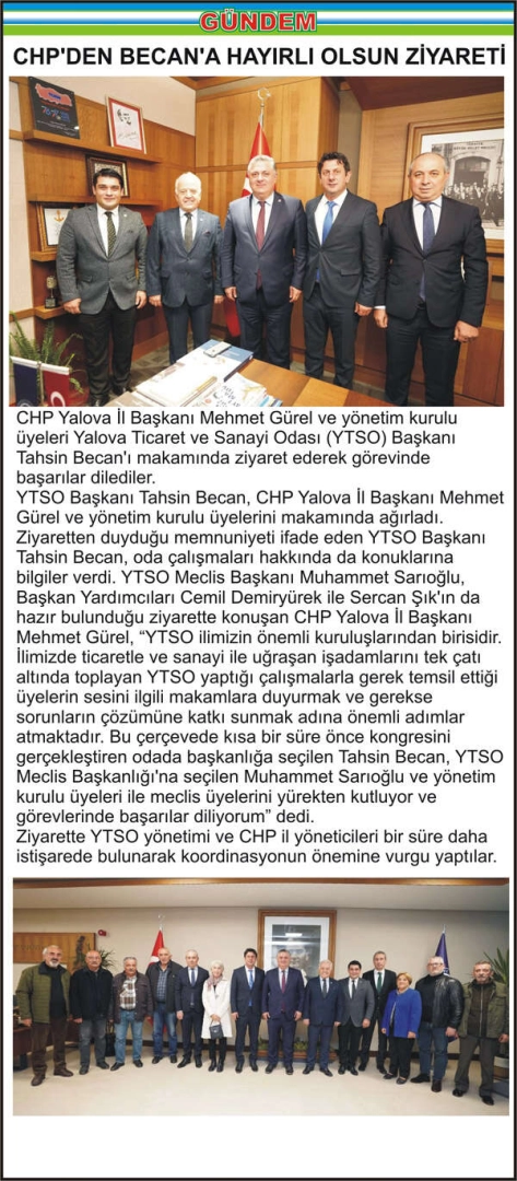 CHP Yalova İl Başkanı Mehmet Gürel ve yönetim kurulu üyeleri Yalova Ticaret ve Sanayi Odası (YTSO) Başkanı Tahsin Becan’ı makamında ziyaret ederek görevinde başarılar dilediler.