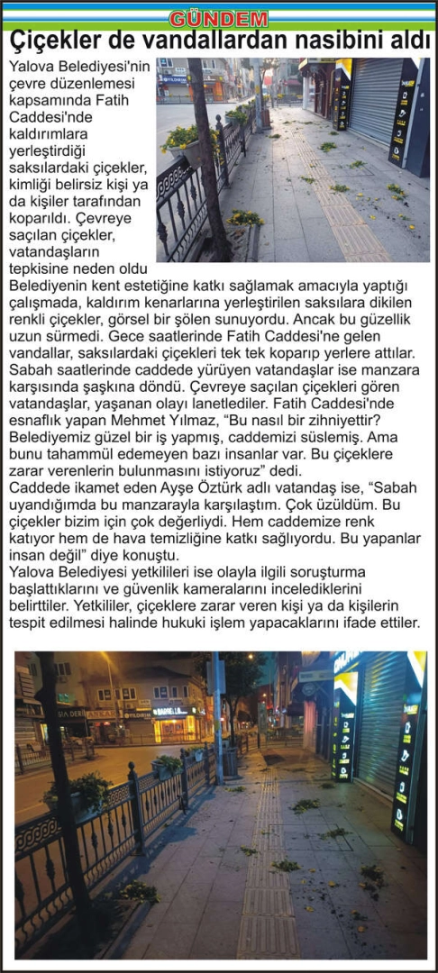 Yalova Belediyesi’nin çevre düzenlemesi kapsamında Fatih Caddesi’nde kaldırımlara yerleştirdiği saksılardaki çiçekler, kimliği belirsiz kişi ya da kişiler tarafından koparıldı. Çevreye saçılan çiçekler, vatandaşların tepkisine neden oldu Belediyenin kent estetiğine katkı sağlamak amacıyla yaptığı çalışmada, kaldırım kenarlarına yerleştirilen saksılara dikilen renkli çiçekler, görsel bir şölen sunuyordu. Ancak bu güzellik uzun sürmedi. Gece saatlerinde Fatih Caddesi’ne gelen vandallar, saksılardaki çiçekleri tek tek koparıp yerlere attılar. Sabah saatlerinde caddede yürüyen vatandaşlar ise manzara karşısında şaşkına döndü. Çevreye saçılan çiçekleri gören vatandaşlar, yaşanan olayı lanetlediler. Fatih Caddesi’nde esnaflık yapan Mehmet Yılmaz, “Bu nasıl bir zihniyettir? Belediyemiz güzel bir iş yapmış, caddemizi süslemiş. Ama bunu tahammül edemeyen bazı insanlar var. Bu çiçeklere zarar verenlerin bulunmasını istiyoruz” dedi. Caddede ikamet eden Ayşe Öztürk adlı vatandaş ise, “Sabah uyandığımda bu manzarayla karşılaştım. Çok üzüldüm. Bu çiçekler bizim için çok değerliydi. Hem caddemize renk katıyor hem de hava temizliğine katkı sağlıyordu. Bu yapanlar insan değil” diye konuştu. Yalova Belediyesi yetkilileri ise olayla ilgili soruşturma başlattıklarını ve güvenlik kameralarını incelediklerini belirttiler. Yetkililer, çiçeklere zarar veren kişi ya da kişilerin tespit edilmesi halinde hukuki işlem yapacaklarını ifade ettiler.