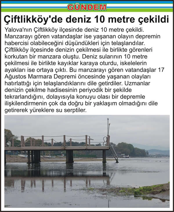 Yalova’nın Çiftlikköy ilçesinde deniz 10 metre çekildi. Manzarayı gören vatandaşlar ise yaşanan olayın depremin habercisi olabileceğini düşündükleri için telaşlandılar. Çiftlikköy ilçesinde denizin çekilmesi ile birlikte görenleri korkutan bir manzara oluştu. Deniz sularının 10 metre çekilmesi ile birlikte kayıklar karaya oturdu, iskelelerin ayakları ise ortaya çıktı. Bu manzarayı gören vatandaşlar 17 Ağustos Marmara Depremi öncesinde yaşanan olayları hatırlattığı için telaşlandıklarını dile getirdiler. Uzmanlar denizin çekilme hadisesinin periyodik bir şekilde tekrarlandığını, dolayısıyla konuyu olası bir depremle ilişkilendirmenin çok da doğru bir yaklaşım olmadığını dile getirerek yüreklere su serptiler.