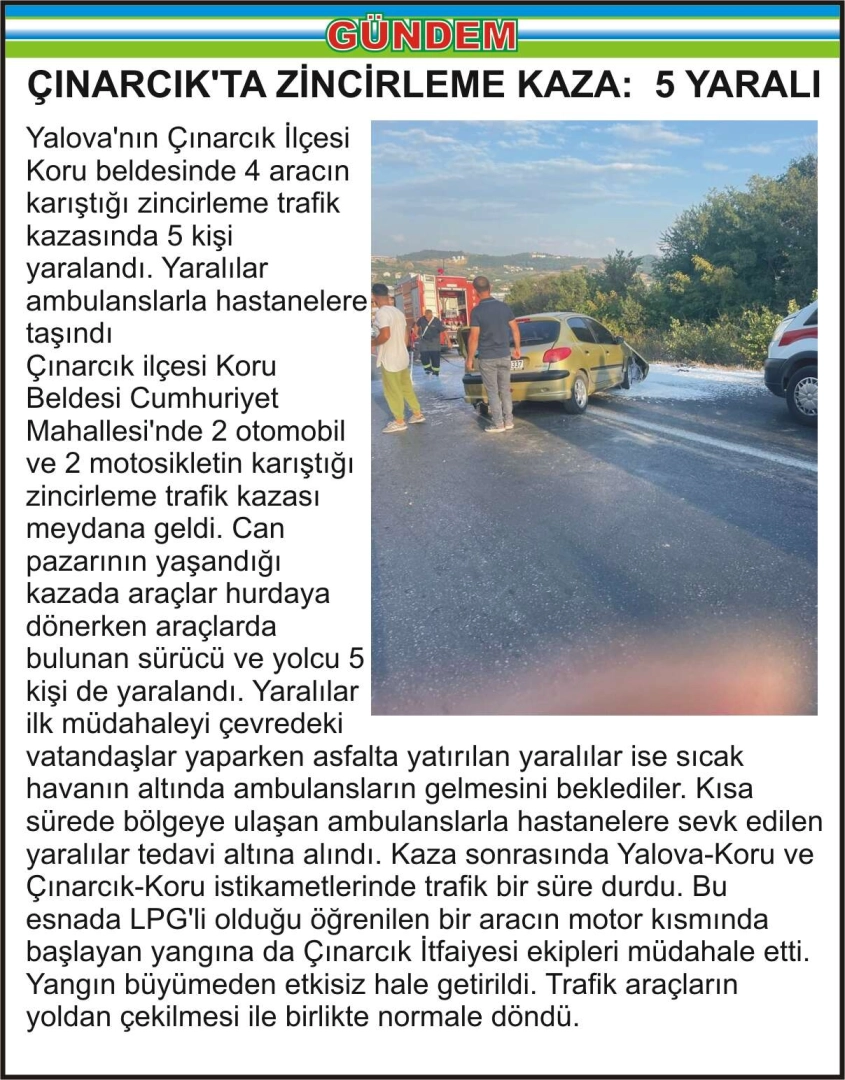 Yalova’nın Çınarcık İlçesi Koru beldesinde 4 aracın karıştığı zincirleme trafik kazasında 5 kişi yaralandı. Yaralılar ambulanslarla hastanelere taşındı Çınarcık ilçesi Koru Beldesi Cumhuriyet Mahallesi’nde 2 otomobil ve 2 motosikletin karıştığı zincirleme trafik kazası meydana geldi. Can pazarının yaşandığı kazada araçlar hurdaya dönerken araçlarda bulunan sürücü ve yolcu 5 kişi de yaralandı. Yaralılar ilk müdahaleyi çevredeki vatandaşlar yaparken asfalta yatırılan yaralılar ise sıcak havanın altında ambulansların gelmesini beklediler. Kısa sürede bölgeye ulaşan ambulanslarla hastanelere sevk edilen yaralılar tedavi altına alındı. Kaza sonrasında Yalova-Koru ve Çınarcık-Koru istikametlerinde trafik bir süre durdu. Bu esnada LPG’li olduğu öğrenilen bir aracın motor kısmında başlayan yangına da Çınarcık İtfaiyesi ekipleri müdahale etti. Yangın büyümeden etkisiz hale getirildi. Trafik araçların yoldan çekilmesi ile birlikte normale döndü.